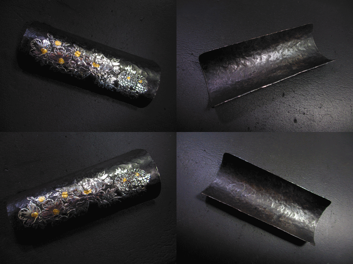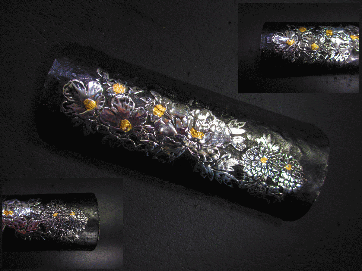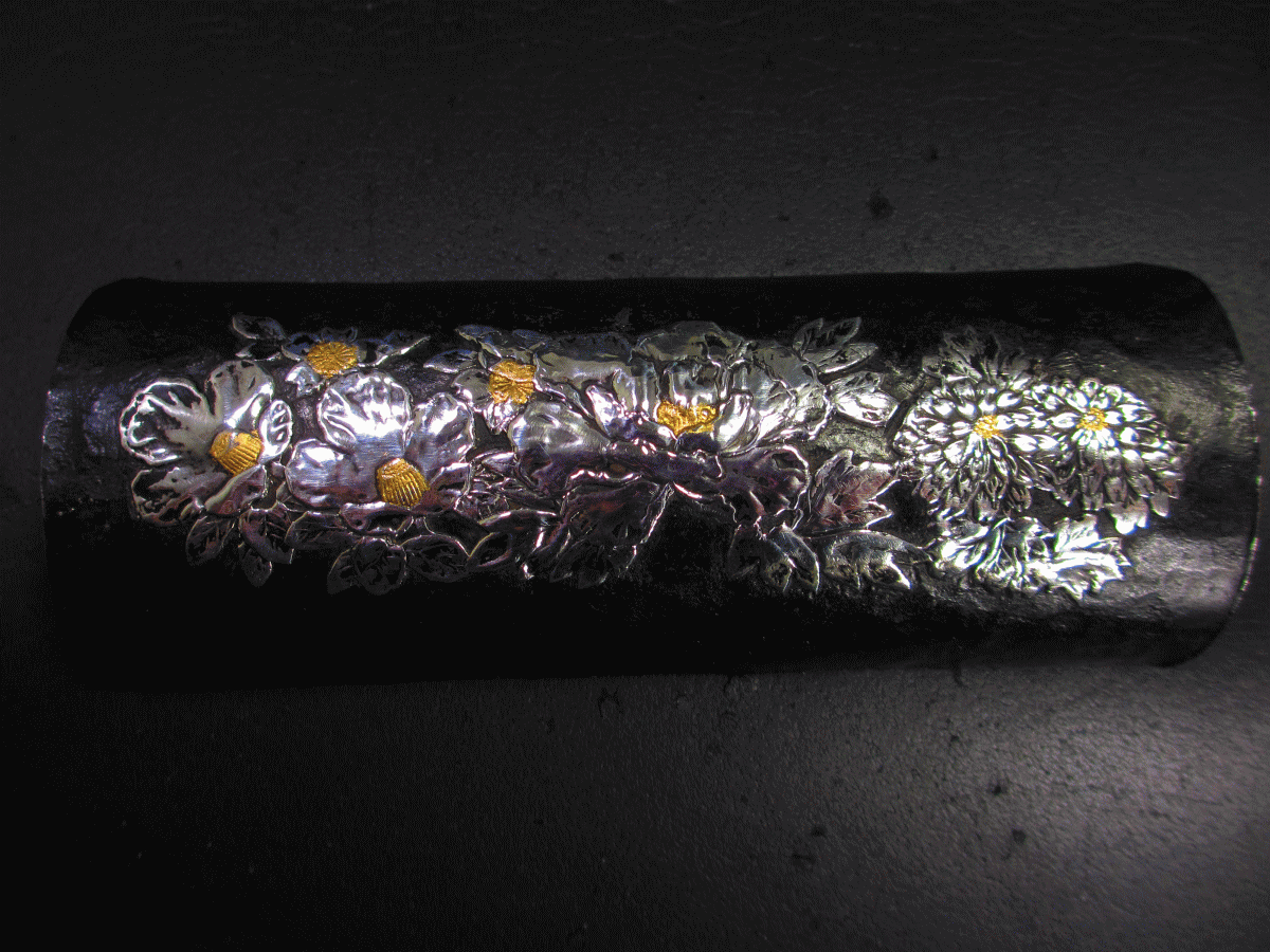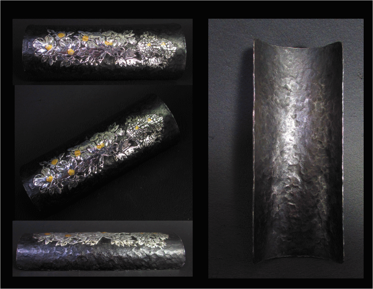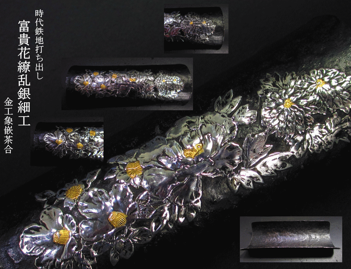 lolipop.jp/upload/20251031/3f1274d5b8d14e79809f7edbd1010165.jpg">| 時代鉄地打ち出し 富貴花繚乱銀細工金工象嵌茶合 茶量 仙媒 煎茶道具 |