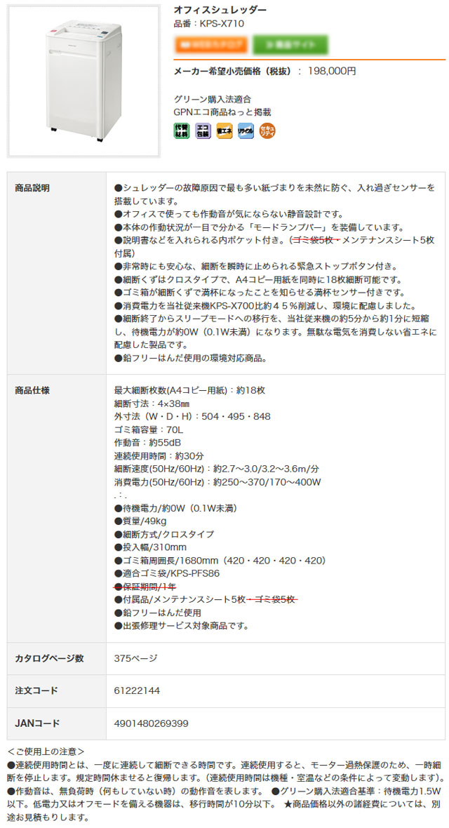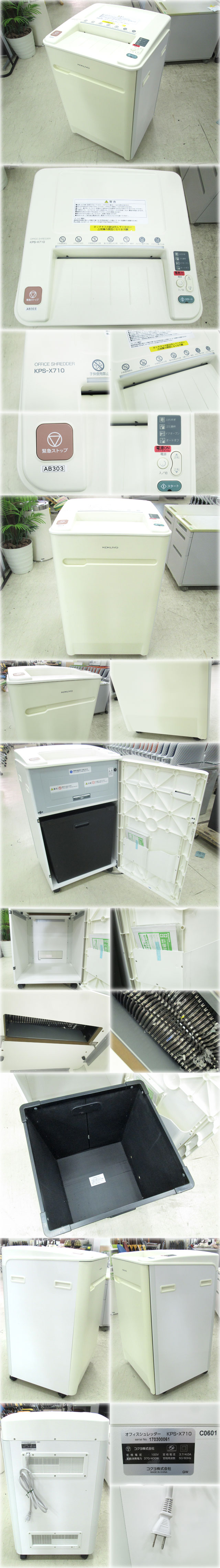 コクヨ クロスカットシュレッダー KPS-X710 を出品いたします。 ■特徴■ シュレッダーの故障原因で 最も多い紙づまりを未然に防ぐ、 入れ過ぎセンサーを搭載しています。 オフィスで使っても 作動音が気にならない静音設計です。 本体の作動状況が一目で分かる 「モードランプバー」を装備しています。 説明書などを入れられる内ポケット付き。 非常時にも安心な、 細断を瞬時に止められる緊急ストップボタン付き。 細断くずはクロスタイプで、 A4コピー用紙を同時に18枚細断可能です。 ゴミ箱が細断くずで満杯になったことを知らせる 満杯センサー付きです。 消費電力を従来機KPS-X700比約45%削減し、 環境に配慮しました。 細断終了からスリープモードへの移行を、 当社従来機の約5分から約1分に短縮し、 待機電力が約0W(0.1W未満)になります。 無駄な電気を消費しない省エネに配慮した製品です。 鉛フリーはんだ使用の環境対応商品。 ■仕様■