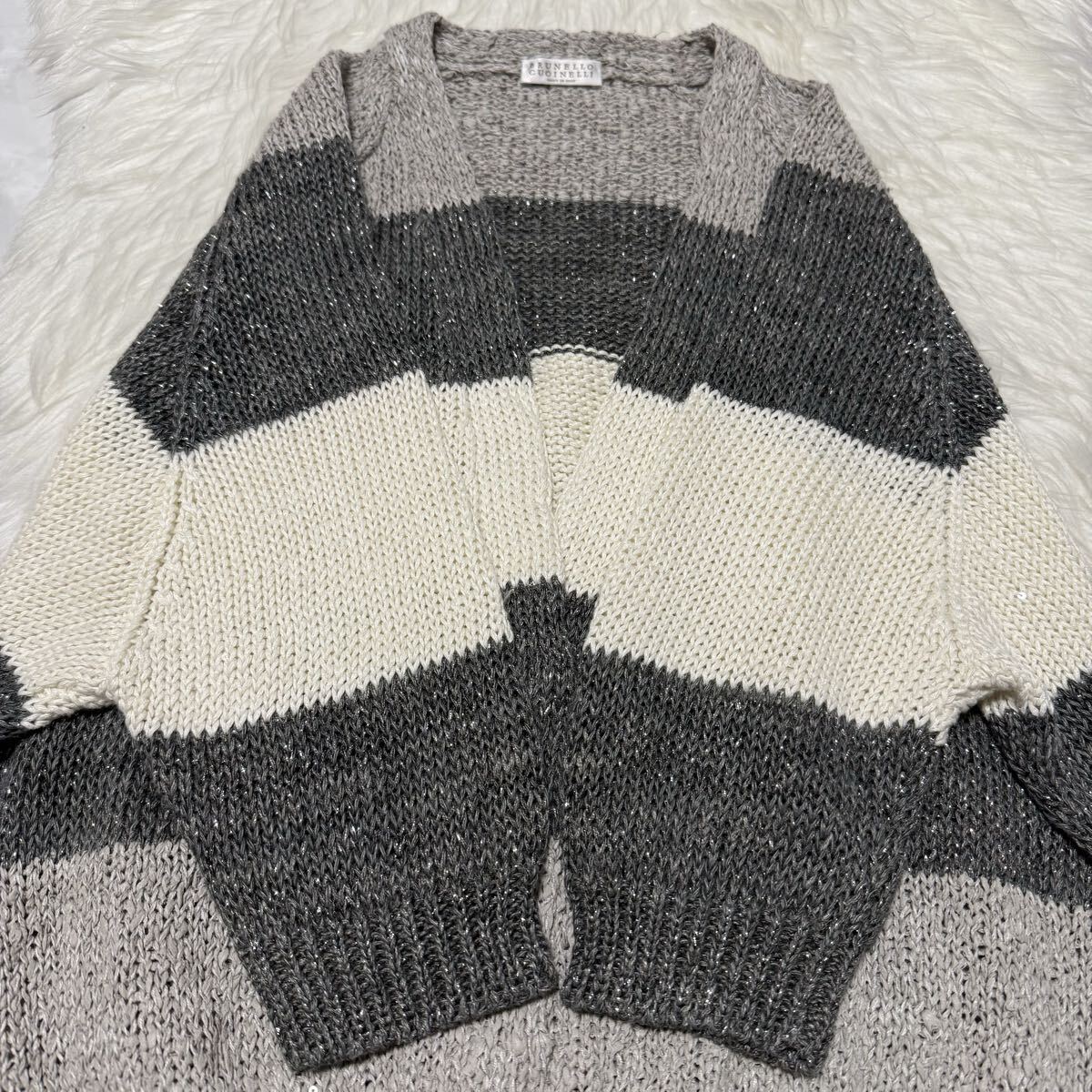 | 本物 美品 コレクションモデル ブルネロクチネリ スパンコール ラメ入り ボーダー ニット カーディガン M グレー系 BRUNELLO CUCINELLI | ||||