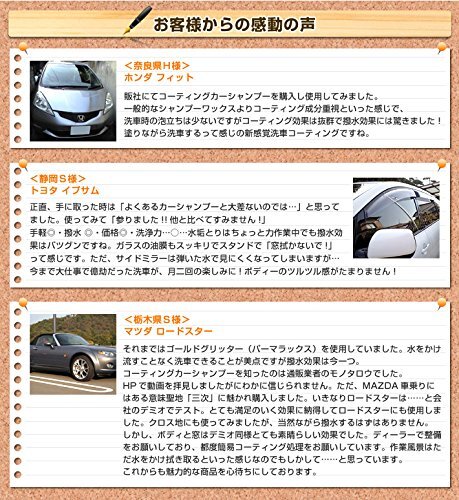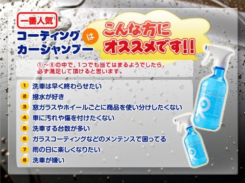 | 商品説明 | 密着性が良く薄くてはがれにくいシリコン膜を瞬時に形成し、素晴らしい撥水性と深い光沢を与えます。 油脂製のWAX成分を使用していないので、汚れが吸着しにくくなります。 窓ガラスに使用しても油膜になりません。また、アルミホイール他各種もOK。 液体のシリコンレジンなので、手では塗れないところにも施工可能。酸性雨や塩害からボディを保護します。 【付属品】洗車スポンジ・マイクロファイバークロス・空容器500ml・詰め替え用ノズル 洗車からコーティングまで、簡単に短時間で行える夢のようなカーシャンプーです。油脂成分を使用していないので油膜などにならず、窓ガラス・アルミホイール・樹脂など全てに使用でき、超撥水効果で愛車を守ります。 持続力は約1ヶ月ですが、定期的なご使用でさらなるツヤと撥水が期待できます。軽自動車:80台 普通車:40台こんな方にオススメです。1.洗車は早く終わらせたい2.撥水が好き3.窓ガラスやホイールごとに商品を使い分けしたくない4.車に汚れや傷を付けたくない5.洗車する台数が多い6.ガラスコーティングなどのメンテナンスで困っている7.雨に日に楽しくなりたい8.洗車が嫌いカーシャンプーの使い方の画期的なコーティング剤です。 洗車をするだけで同時にコーティングが出来ます。 石油系溶剤やカルナバなどは不使用でエコです。 ワックスインシャンプーとは、全く異なります。 【ご注文からお届けまでについて】 ※トラブル防止のため入札、落札前に必ずご一読をお願い致します。 落札後のお客様都合でのキャンセルはお受けできませんので、予めご了承ください。 1.ご注文 : ご注文は24時間受け付けております。 2.注文確認 : ご注文時、オーダーフォーム等必要事項を入力お願い致します。 3.入金確認 : 前払い決済をご選択の場合、ご入金確認後、配送手配を致します。 ※落札後5日を過ぎてもご連絡が無い場合は、落札者都合でのキャンセルとさせていただきます。 4.出荷 : 配送準備が整い次第、出荷致します。配送業者、追跡番号等の詳細をご連絡致します。 ※契約先の倉庫から最適な配送方法を選択して発送させていただきます。 そのため、配送業者・配送方法のご指定は承れません。予めご了承下さい。 発送方法は、商品サイズ、重量、お届け先により適切な運送方法を使用いたします。 ※通常、落札から2〜3営業日程度で発送致しますが、混雑状況によりお時間を頂く場合もございます。 また北海道、沖縄及び離島の場合、到着まで1〜2週間程度かかる場合もございます。 5.到着 : 出荷後、1-3日で商品が到着します。 ※商品の到着までは、決済確認後、3-7日程度でお届けとなります。 ※商品の製品のサポートはできません。保証のあるものはメーカーへご連絡願い致します。 商品は新品の未使用品となっておりますが、 長期保管により、外箱・パッケージに多少の痛みなどがある場合がございます。 商品自体には不具合などございませんが、万が一あった場合はご対応させていただきますので、ご安心ください。 商品管理、在庫管理は行っておりますが、商品の不具合等でお届け出来ない場合は、 銀行口座へ振込返金となりますので、予めご了承いただきますようお願い申し上げます。 手続き削減の為、こちらからは発送完了までご連絡を行なっておりません。 原則、電話対応はしておりませんので、ご質問等はお問い合わせ、またはメールにてお願い致します。 土日祝祭日はご質問や落札されても商品発送等の、対応ができない日もございます。 予めご了承ください。 |