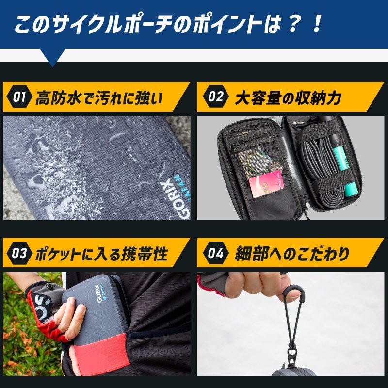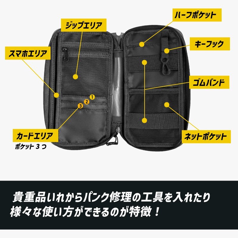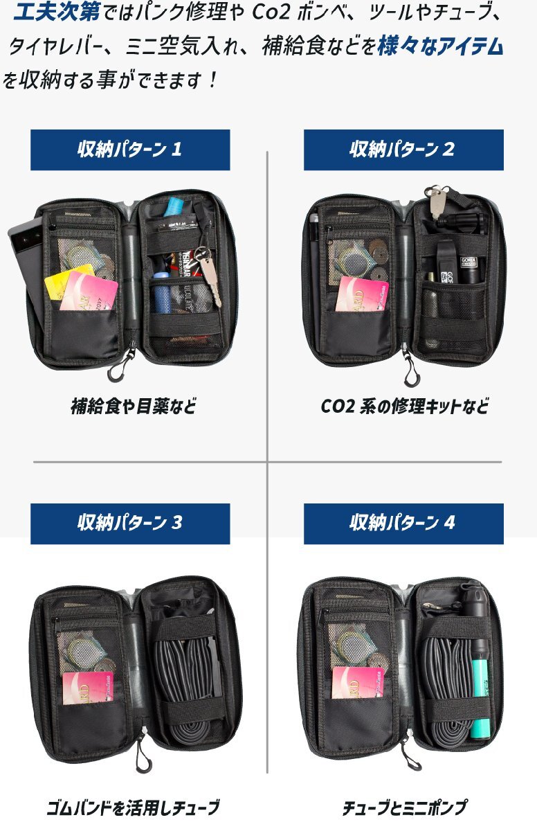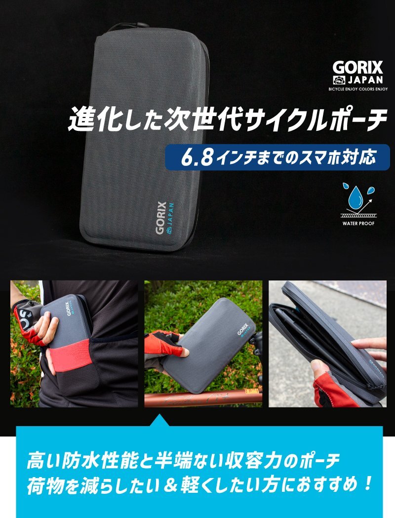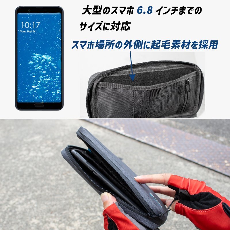 高い防水性能と半端ない収容力のサイクルポーチ 自転車でのライド時に極力荷物を減らしたい&軽くしたい方におすすめのサイクルポーチ。 サイクルジャージの背中ポケットにぴったりと収まるサイズでとてもコンパクトかつおしゃれで機能的なポーチです。 大型の最新スマホ6.8インチまでのサイズに対応。スマホケースとして、そして小銭やカード、補給食、コードなど様々な小物を一つにまとめる事ができる万能ポーチ。 サイクルジャージの背中に入りそして防水性を兼ね備えているのでサイクリングにとても適したサイクルポーチとなっています。 そして外観は年代とわず持てるシンプルでスマートなデザイン。 サイクルシーンだけでなくアウトドアや日常でもお使い頂けます。 サイクルポーチに求められるポイント ・汗で蒸れたり濡れたりしないで汚れに強い ・そこそこの物は入る収納力 ・ジャージの背中に入る携帯性 ・細部へのこだわり [雨や汗から守る] 防水性のあるメイン生地(高防水生地600Dポリエステル)とYKK耐水性ジッパーを組み合わせで 確かな防水性を実現。止水ジッパーはYKK。 表面にはTPUコーティングとそして縫い目のないシームレス溶接構造でさらに防水性を高めています。 雨が強い時はジッパー側を下にして下さい。 (600D(デニール)リュックの底部に使われる事が多い程に分厚く強度がある) (TPUとは弾力性のある素材で、防水性に優れ汚れにも強い) [汚れに強い] TPUコーティング加工は汚れに強く水分が付着しても簡単に拭き取る事ができる。 タフなサイクリングやアウトドアだけでなく日常使いにも最適です。 [大容量の収納力] 大型の最新スマホにも対応した6.8インチまでのスマートフォンも入るサイズ。 スマホ場所には起毛素材を採用していて画面を接触による傷から保護します。 ポーチ内にはポケットが小分けに作られていて整理しやすく、見やすくなっています。 ポーチにはジップ付きの小銭スペースやカード、スマホ、鍵などの専用スペースを設けられて使いやすい。 また工夫次第ではパンク修理やCo2ボンベ、ツールやチューブ、タイヤレバー、ミニ空気入れ、補給食などを様々なアイテムを収納する事ができる。 [携帯性] サイクルジャージのバックポケットに収まるサイズでコンパクト。 サイクルポーチに小物を一つにまとめる事で本当に必要な荷物が最小限に抑えられ軽量化に。 サイクルポーチ本体はとても軽量の105g! [細部にこだわり] 細かい部分にもこだわっています。 1.スマホ収納ポケット外側に起毛素材を採用していて画面を接触による傷から保護します。 2.グローブを装着しても開閉しやすい大きいフック 3.ジッパーのブラブラを防止するジッパーストッパー [様々なシーンで] 自転車通勤、ロードバイクやクロスバイク、mtb、ミニベロなどでのライドのみならず高防水性でタフな事でアウトドアシーンやスキー、スノーボード、旅行、日常使いにも最適です。 シンプルで落ち着いたデザインで老若男女問わずしっくりくる。 商品内容サイクルポーチ(サイクルウォレット) 素材高防水生地600Dポリエステル, 表面TPUコーティング、シームレス溶接構造、YKK耐水性ジッパー 重量超軽量105g 寸法長さ19x高さ10x厚み2.5cm 収納ポケット仕様6.8インチまでのスマートフォン、コインや紙幣、カード、キー 、補給食など様々な小物収納可能 | |