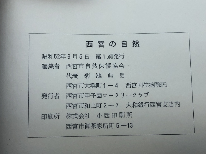 | 西宮の自然 (1977年) 西宮市甲子園ロータリークラブ 西宮自然保護協会 | |