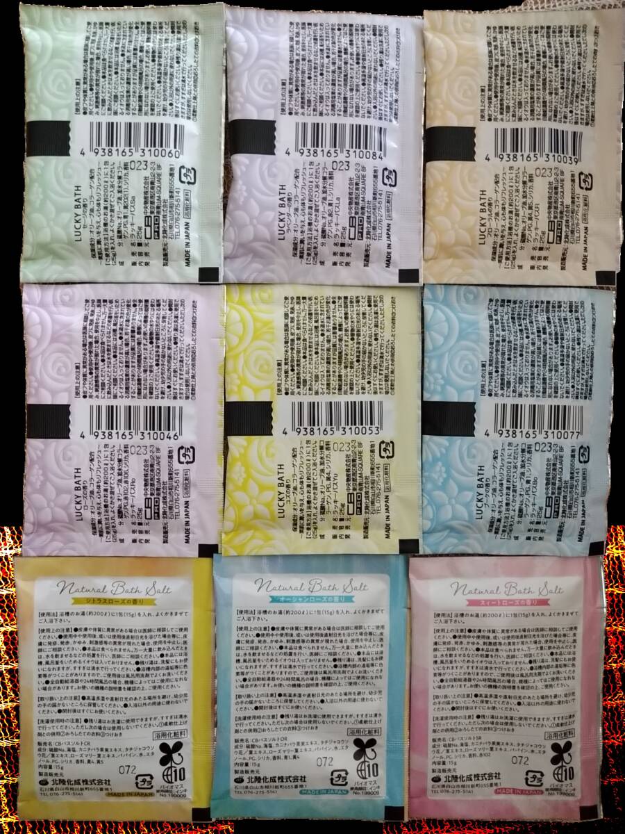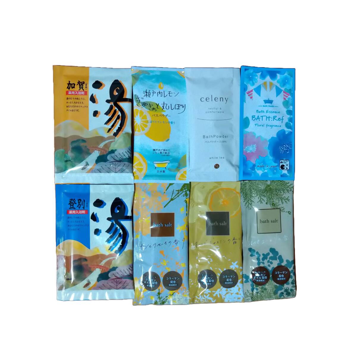 パウダータイプの入浴剤を中心に固形の炭酸発泡の入浴剤も入っています。