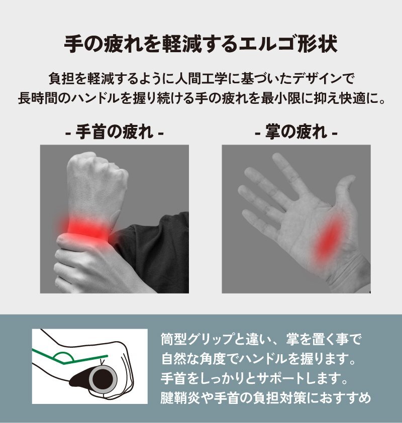 人間工学に基づいたエルゴノミック形状で、手のひら全体をしっかりとサポートし、力を分散させることで疲れを和らげます。