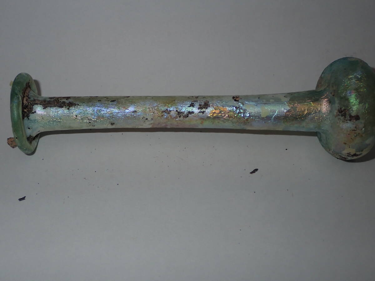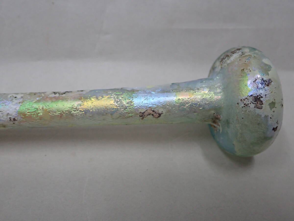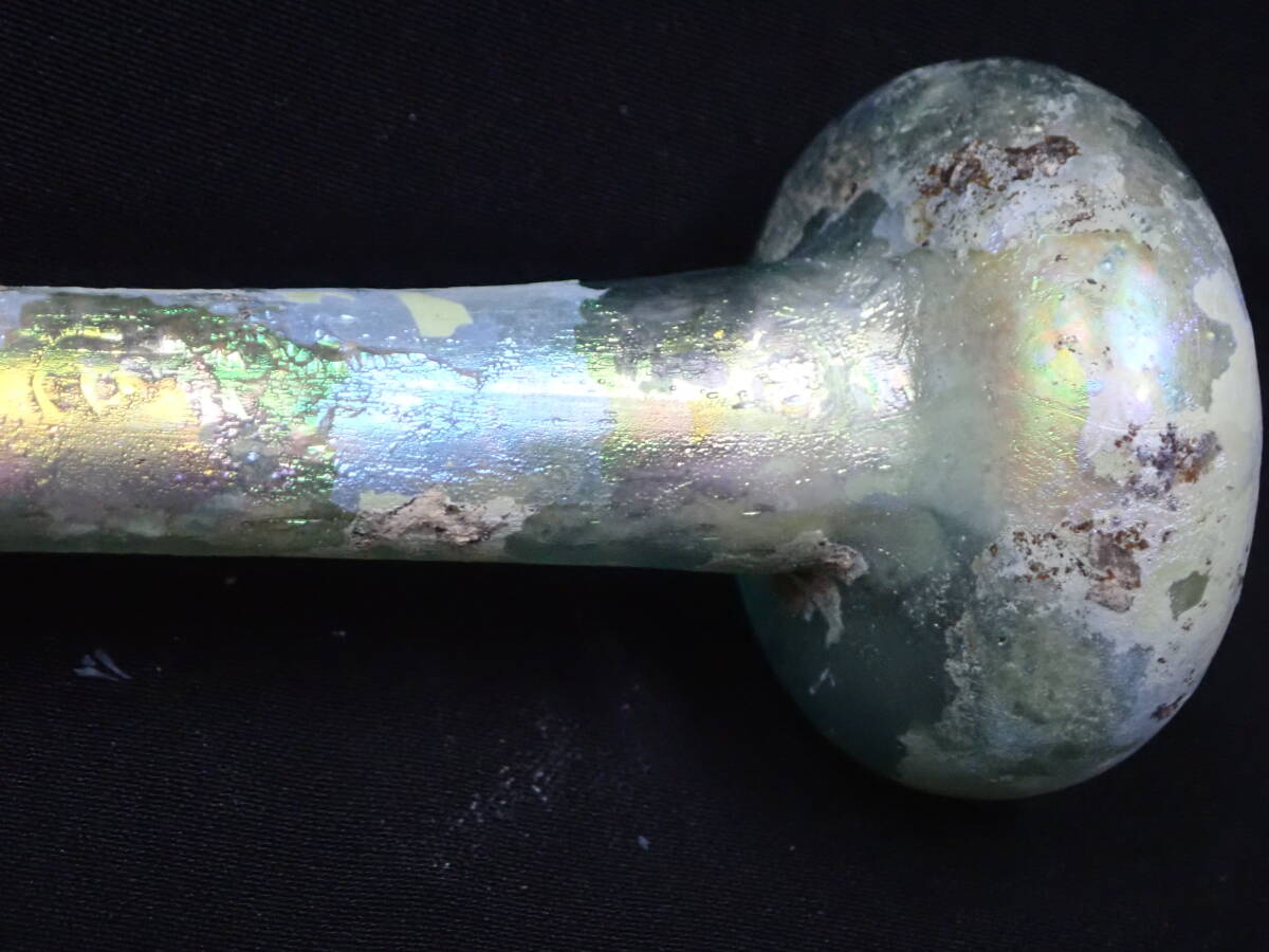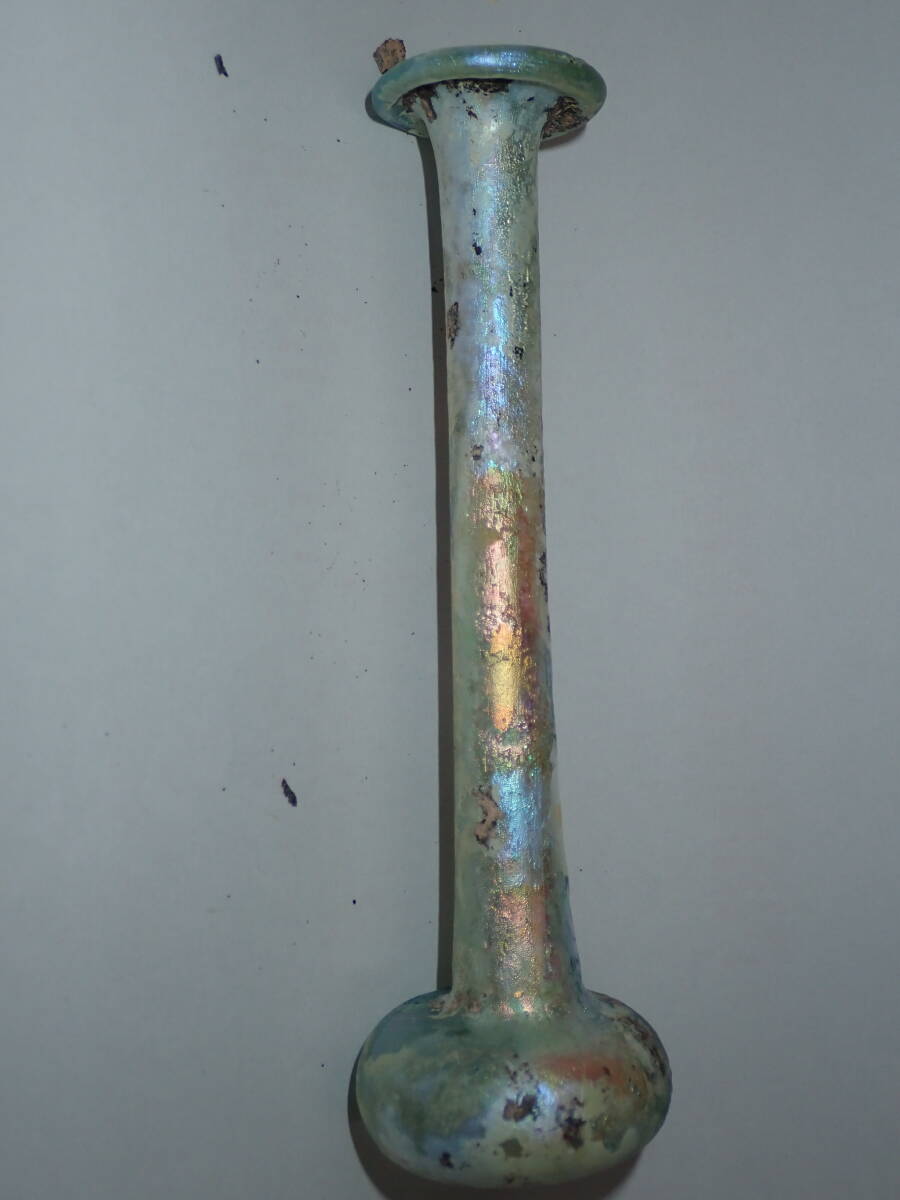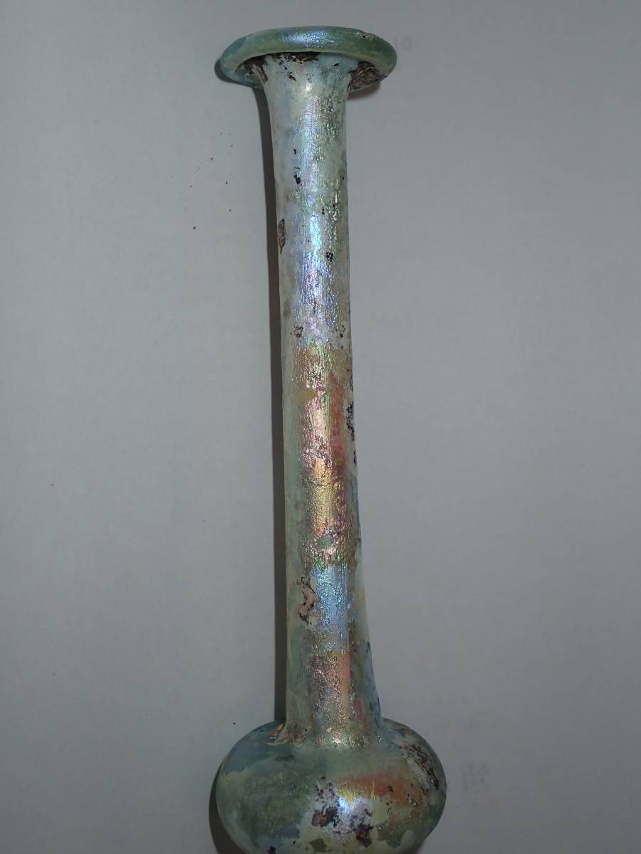 虹色の銀化が美しいローマンガラです。完全品で状態もよく、ガラス本来の透明度のある無傷のローマンガラスです。ほぼ全面に虹色の銀化も見られます。香油瓶などとして使用されたものと思われます。どうぞよろしくお願いいたします。