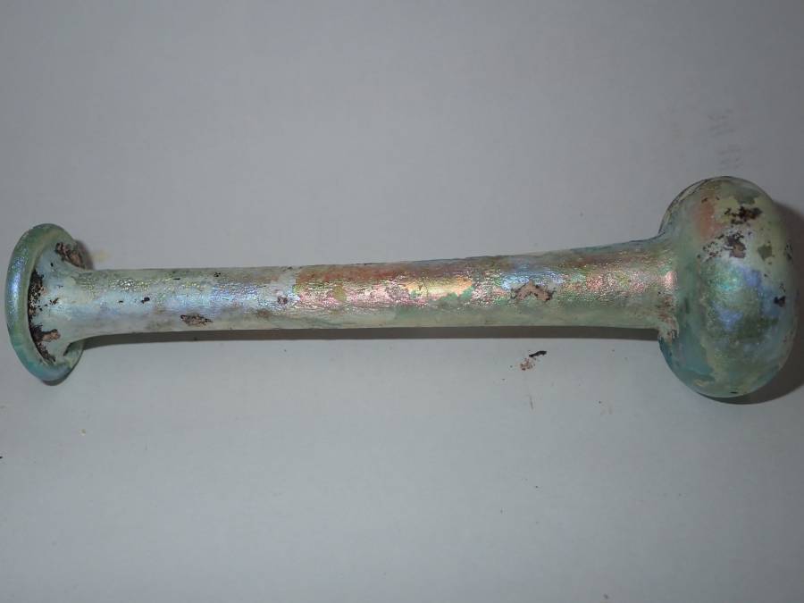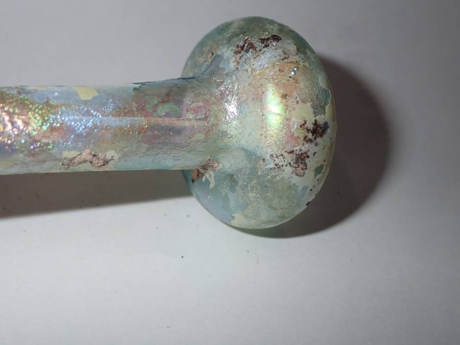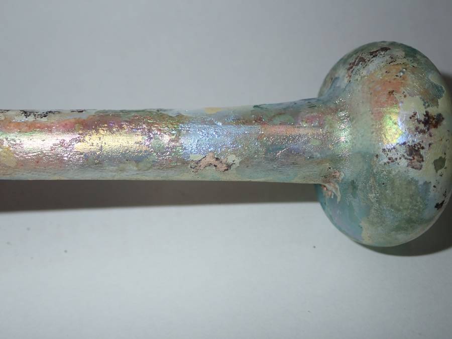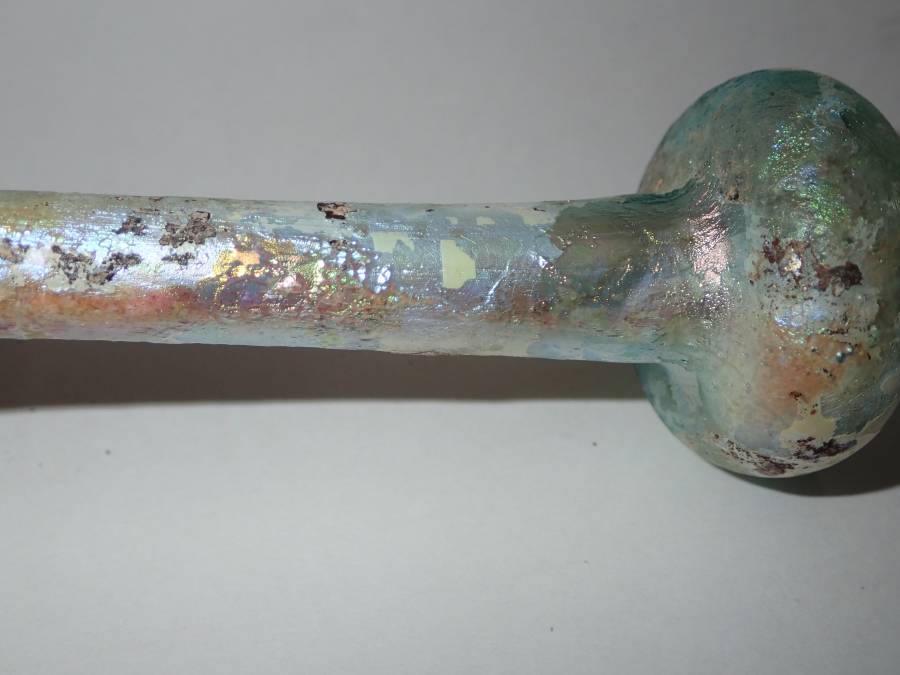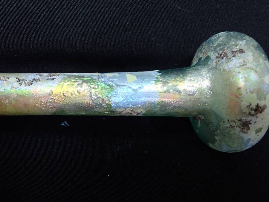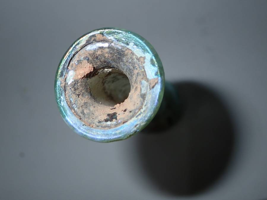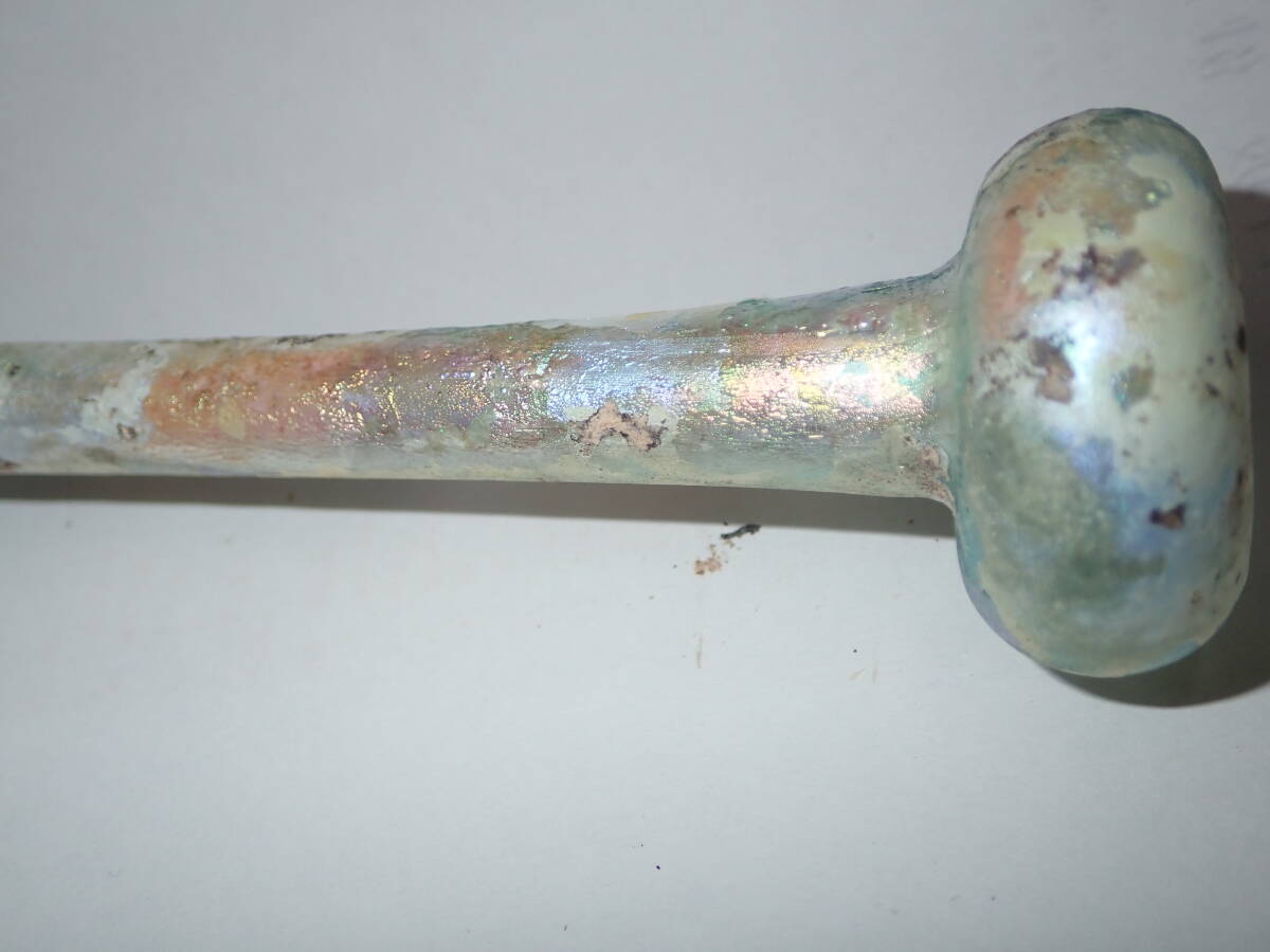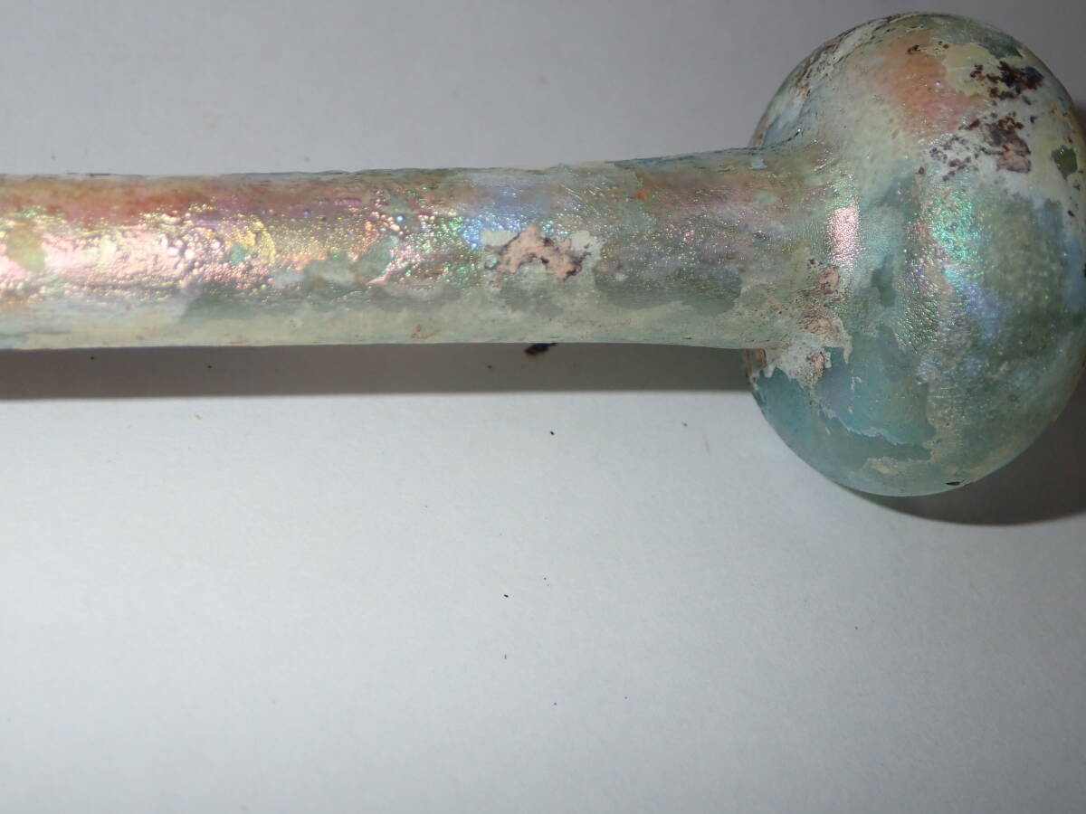 虹色の銀化が美しいローマンガラです。完全品で状態もよく、ガラス本来の透明度のある無傷のローマンガラスです。ほぼ全面に虹色の銀化も見られます。香油瓶などとして使用されたものと思われます。どうぞよろしくお願いいたします。