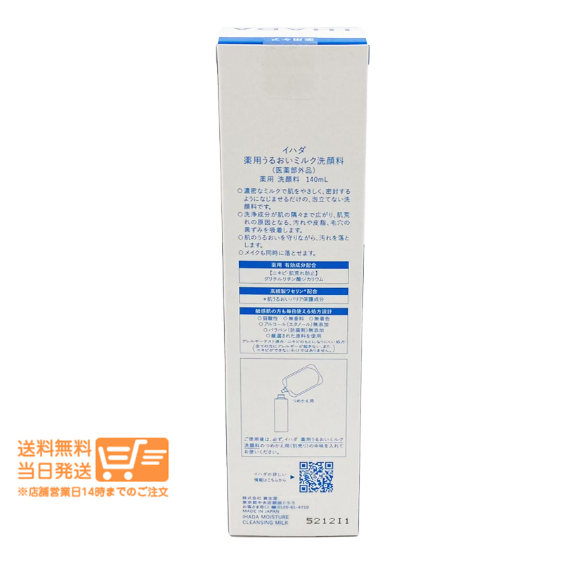 資生堂 IHADA イハダ 薬用うるおいミルク洗顔料 140ml 密封するように洗う、泡立てない洗顔料敏感肌の方でも毎日使える低刺激設計弱酸性無香料無着色アルコール(エタノール)無添加パラベン(防腐剤)無添加厳選原料使用ポイント濃厚ミルクタイプ泡立ていらずメイク落としにも使い方手のひらにディスペンサー2回押し分をとり、小鼻など毛穴の気になる部分から、やさしくくるくる円を描くように顔全体に広げます。よくなじませた後、水またはぬるま湯で十分に洗い流します。