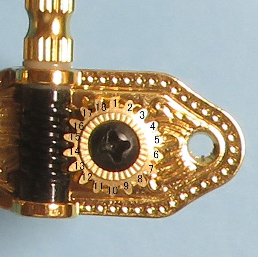 ギヤ比1:18 のクラシックギターペグは、スペイン製の高級モデルに多いですが、一般のクラシックギターペグのギヤ比は、1:14です。