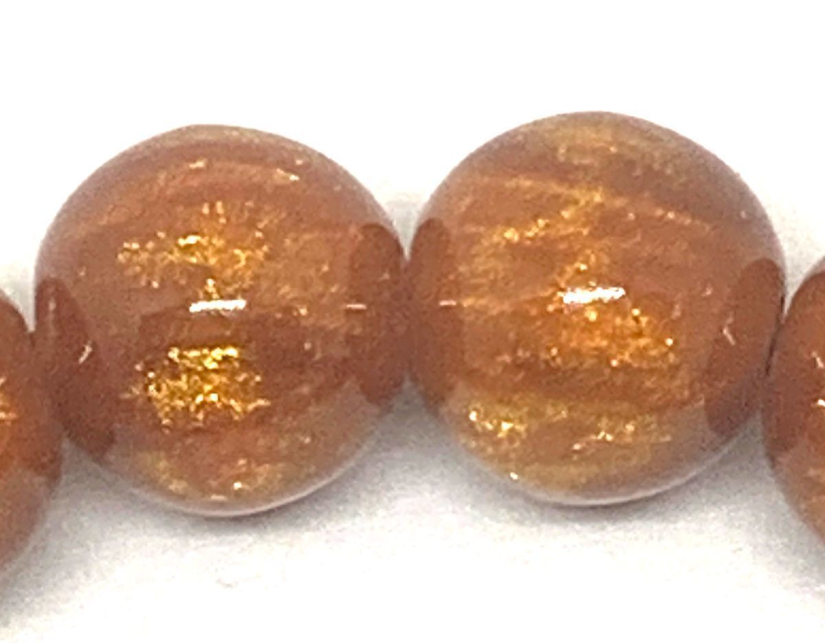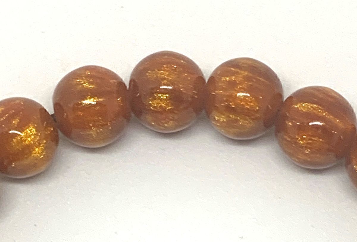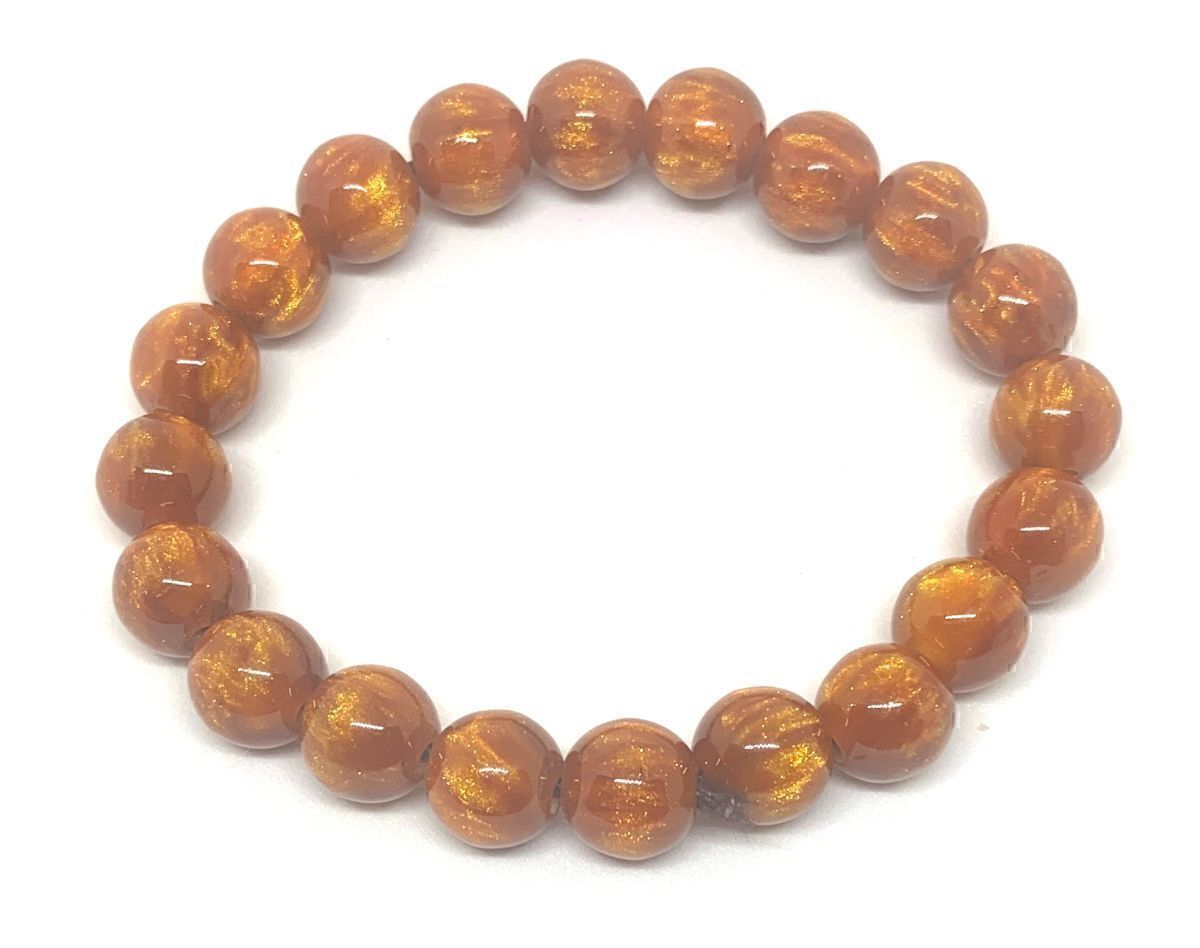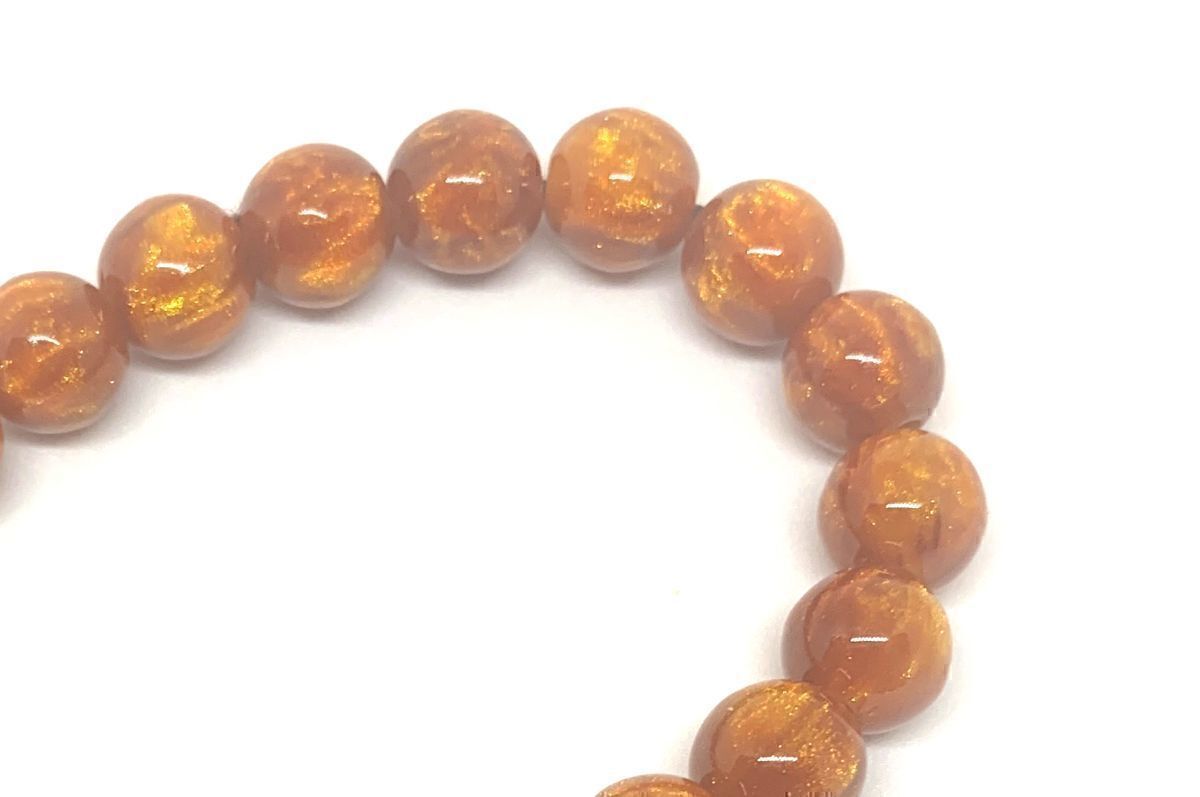 明るい褐色の中に金色が絶妙に輝いています。これが天然石なら40グラムはありますが、約12グラムと軽いです。木製のブレス程度の重さです。アンバー(琥珀)と樹脂から丁寧に加工されています。手首周囲17センチまでの方に。