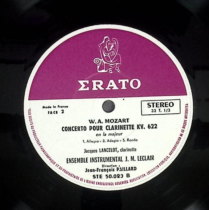 説明不要の名盤、仏ERATOの最初期ステレオにおけるモーツアルトの協奏曲の名演名盤から、ランパル&ラスキーヌによるフルートとハープのための協奏曲K299とクラリネット協奏曲です。今回、ご紹介いたしますのは、仏ERATOのオリジナルピンク白半円ラベルの最初期フラットナイフエッジのStereo盤(189g)が、ERATOの刻印が入ったオリジナルの白色インナースリーブに収められた1枚です。