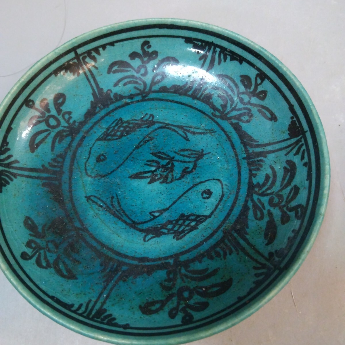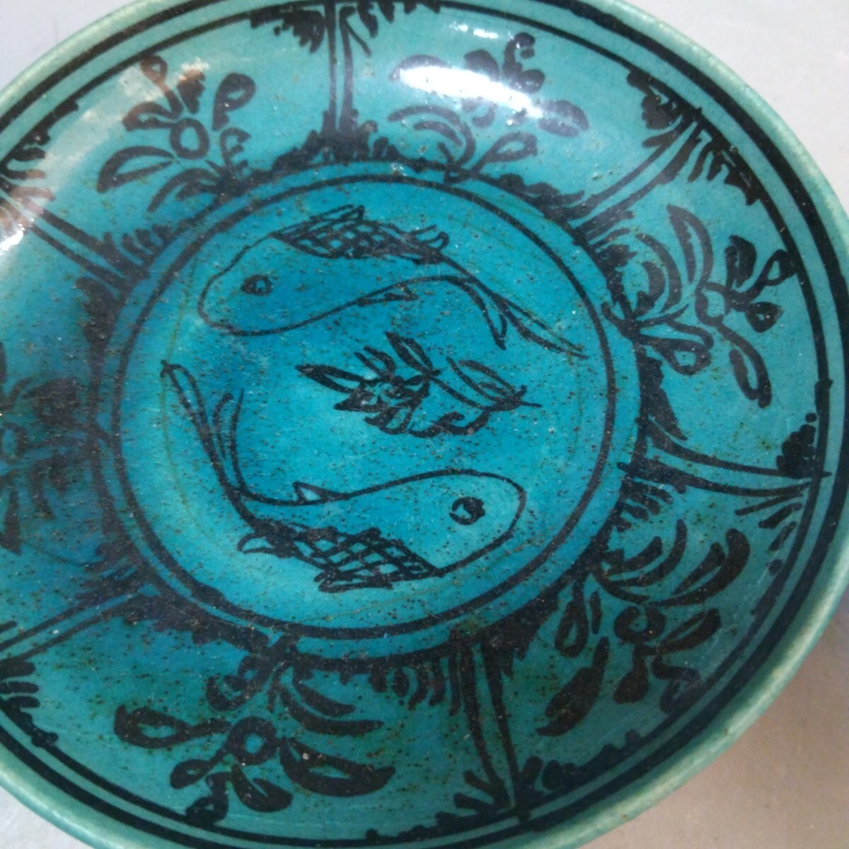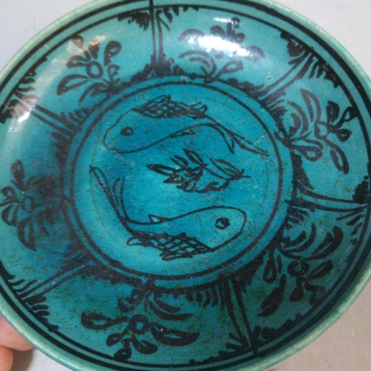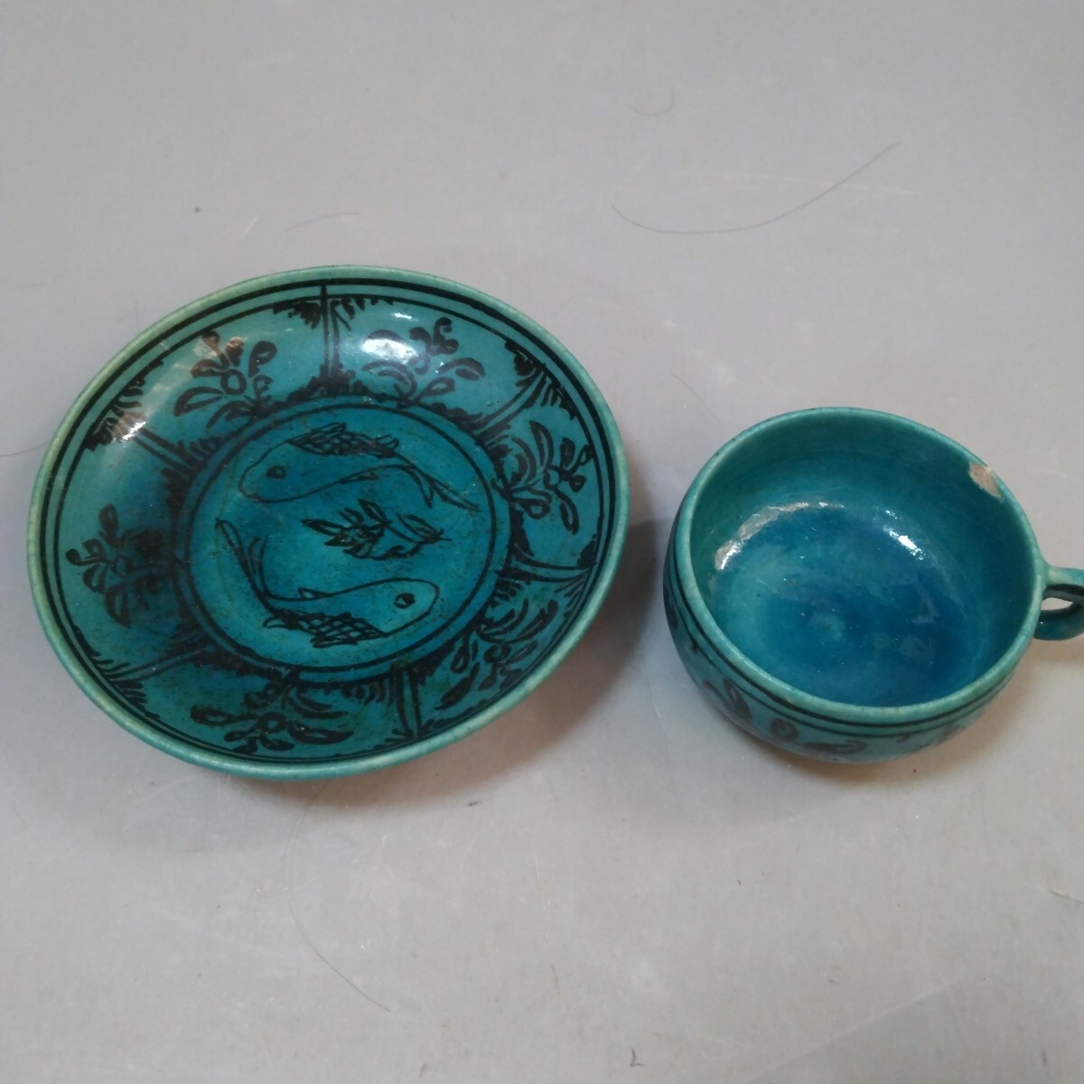 魚が非常によく書けて大変素晴らしいハイクラスのものです。口に小さなホツがありますがほとんど気になりません。盃口径7センチ高台径5センチ高さ4センチ皿口径13センチ高台径6、5センチ高さ3センチ