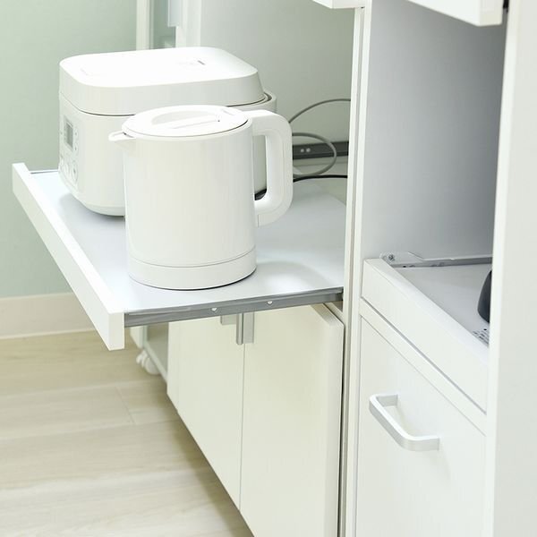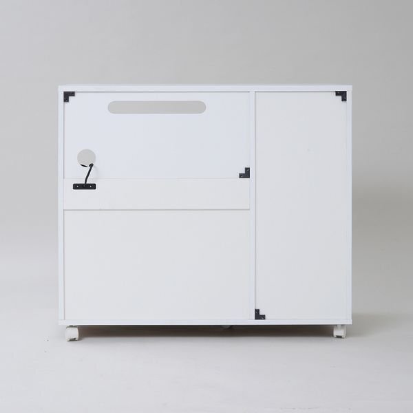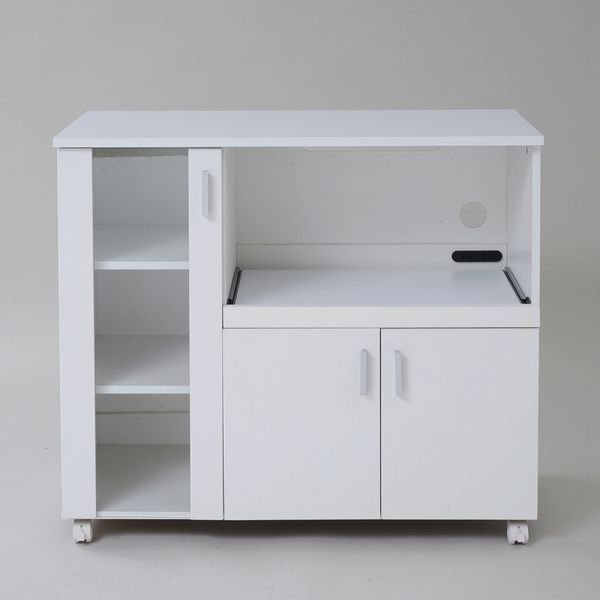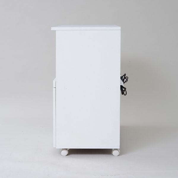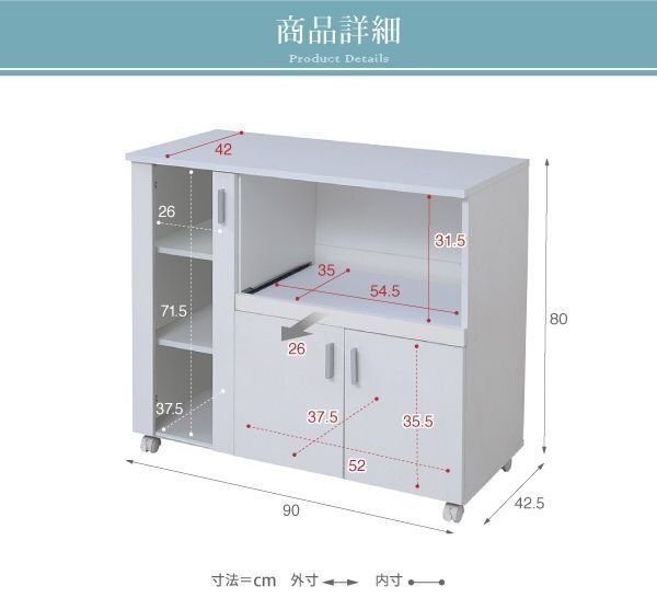 | 【カラー】 ホワイト 【サイズ】 外寸:幅90×奥行42.5×高さ80cm 内寸: 左扉内:幅26×奥行37.5×高さ71.5cm 右下扉内:幅52×奥行37.5×高さ35.5cm スライド部:幅54.5×奥行35×高さ31.5cm スライド引き幅:26cm 左扉内可動棚:幅28×奥行36×厚み1.5cm(3.2cmピッチ3穴) 右下扉内可動棚:幅56.5×奥行36×厚み1.5cm(3.2cmピッチ3穴) 作業面:幅90×奥行42×高さ80cm 【材質】 本体:プリント紙化粧合板 天板/スライド棚:合成樹脂化粧パーティクルボード(塩化ビニル樹脂) 【生産国】 マレーシア 【梱包】 サイズ:97×45×18cm、重量:34kg 【耐荷重】 天板:(約)10kg以下 可動棚/スライド棚:(約)5kg以下 【その他】 ・2口コンセント(合計1500W)/コード長さ180cm ・[可動棚]大1枚、小2枚 【組み立て品】 お客様による組み立てが必要です。 |