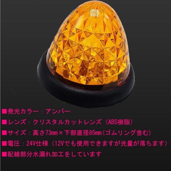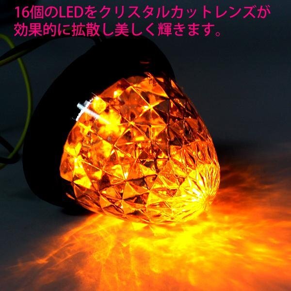 | 16個のLEDをクリスタルカットレンズが効果的に拡散し美しく輝きます。 従来の球タイプに比べ高輝度なLEDで、長寿命、低消費電力、デザイン性と機能性を両立しました。 ■発光カラー:アンバー ■LED:16連SMD ■レンズ:クリスタルカットレンズ(ABS樹脂) ■サイズ:高さ73mm×下部直径85mm(ゴムリング含む) ■電圧:24V仕様(12Vでも使用できますが光量が落ちます) ■配線部分水漏れ加工をしています ※配線部の防水コーティングにより、耐久性及び防水性の向上は期待できますが、 完全防水では御座いませんので、必要に応じ防水処理を施してください。