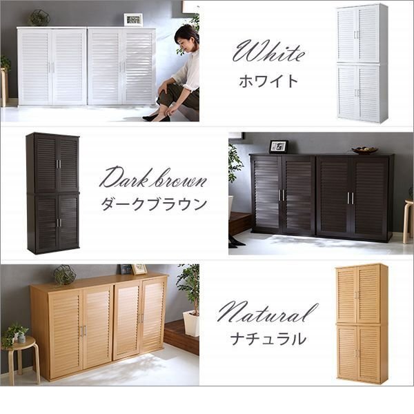 | 【ポイント】 ①縦に2台組み合わせられるから、省スペースでも大容量収納を実現しました。 ②有効内寸が(約)30cmあるので、男性用の靴も収納可能です。 ③ルーバー扉仕様だから通気性抜群です。 ④可動棚(合計10枚)付きだから、棚の高さを調節してスペースを有効活用出来ます。 ⑤カラーは落ち着いた3カラーから展開です。 |