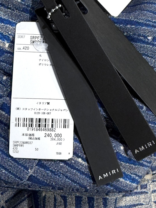 2013年にスタートした 《 AMIRI - アミリ - 》は、エフォートレスでクールなストリートウェアを得意とする L.A の人気レーベル。 創設者 Mike Amiri の子供時代を形作ったサブカルチャーをインスピレーションに、芸術性に富むダメージ加工のデニムジャケットや、 バイカージーンズ、グラフィックTシャツなど、アンダーグラウンドパンクとハリウッドに影響を受けたアイテムが特徴です。 ラグジュアリーかつ脱構築的なアーバンエッセンシャルを提供しております。 そんな 《 AMIRI - アミリ - 》の、「西海岸ラグジュアリー」と「グランジ」が融合した、ブランドロゴモノグラム柄トラウザーズパンツです。 パッと見は、西海岸の風を感じさせるフェードの効いたデニム。 しかし、実はこれ、肌触り滑らかな上質なトロピカルウールをベースに仕立てられた「ドレス・トラウザーズ」! 小僧が履くデニムとは一線を画す、しなやかな穿き心地と美しいドレープ。 そこに、ブランドロゴを幾何学的に配したモノグラムと、職人技が光るグラデーション、そして計算され尽くしたスプラッシュデザインとが相まった、 「極上素材」にあえて「ヤンチャ」な遊び心を込めた仕上がり。 お気に入りのハイカットスニーカーや、色気のあるブーツに合わせてフレア具合を調整できるギミックも見逃せません。 Tシャツ1枚に合わせても、圧倒的なオーラを放つ、本物の魅力を知る大人のパンツとなっておりますので、この機会に是非ご検討ください。 もちろん正規品・新品未使用品ですので、安心してお求め頂けます。 |