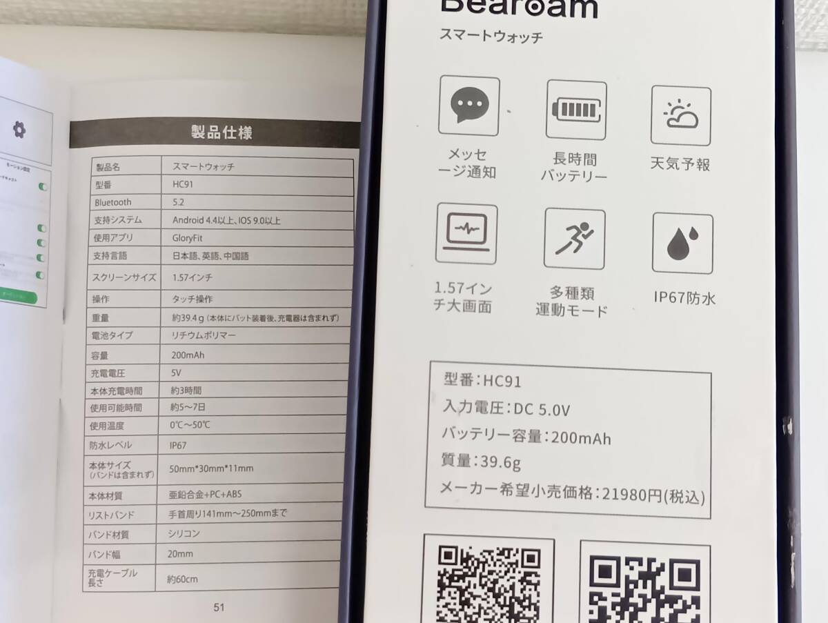 | ☆Bearoam HC91 ウェアラブルデバイス スマートウォッチ 替えベルト 充電ケーブル 取扱説明書付属 通電確認済 |