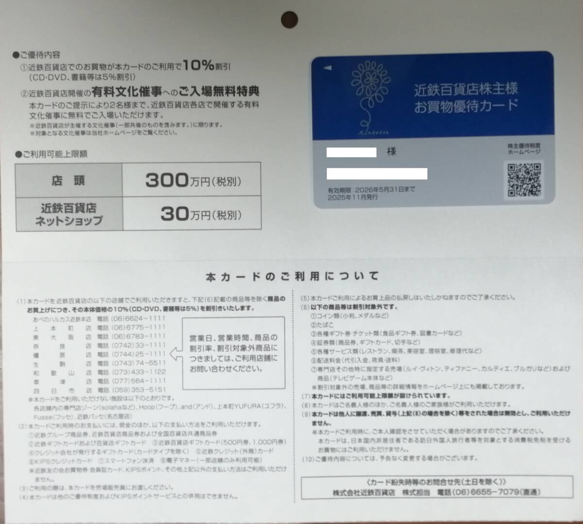 | ■㈱近鉄百貨店の株主優待の女性名義のお買物優待カード1枚です。 |