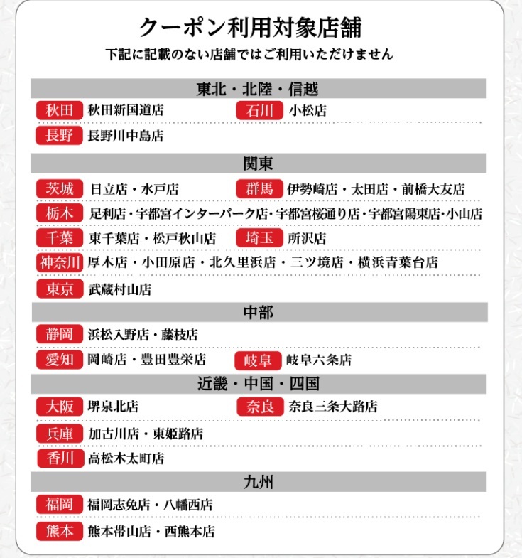| ■本クーポンをご利用頂ける店舗が限定されておりますので、商品画像の2枚目をご参照ください(記載のない店舗ではご利用頂けません)。 |
