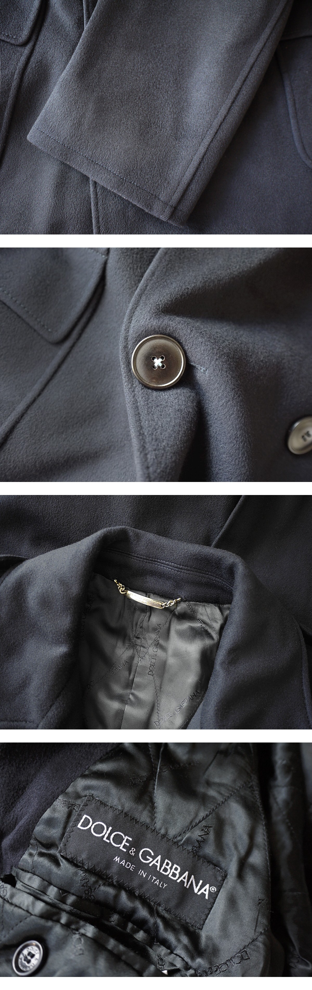 ドルチェ&ガッバーナならではのショルダーラインからウエストにかけての計算された美しいラインは、このブランドお家芸ともいわれ、着用時にしわが全く出ず、大変洗練されたカッティングにて仕立てられております。品質、デザインどれをとっても一級品でございますので、今期のメインコートをはじめ、一生もののとしてもお勧めできる逸品です。この機会にぜひよろしくお願いいたします。 brand Dolce & Gabbana made in Italy price \380,000(参考上代) material wool 80% cashmere 20% color Navy size 50 肩幅46 着丈101 袖丈65 身幅55 (多少の誤差はご了承ください。) 状態 使用感の少ないきれいなお品物でございます。裏地含めダメージは見受けられず末永くご使用頂けることをお約束させて頂きます。 |