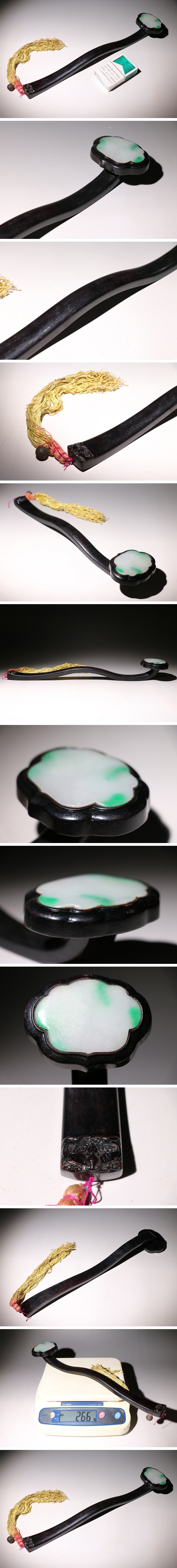 | ◇商品説明◇ | 如意の出品です。状態につきましては、スレ、キズ、ヨゴレ等があり、翡翠に着色が施されていると思われますので画像にて御確認の程宜しくお願い致します。