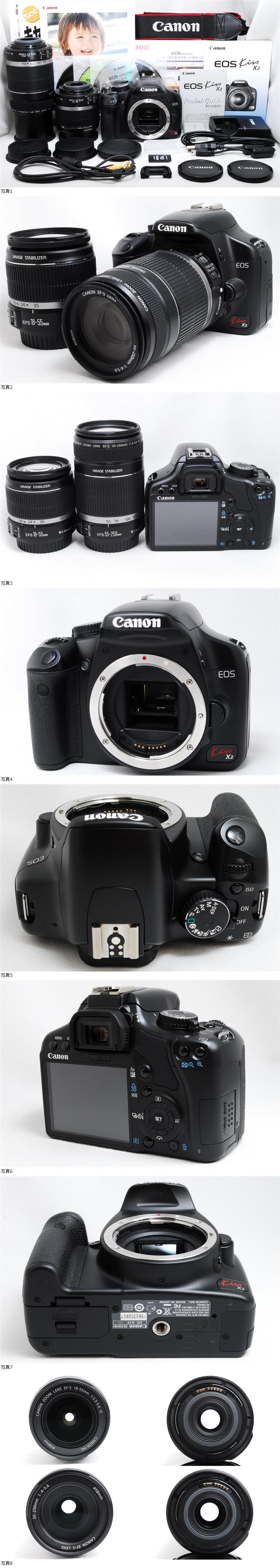 コンディション良好な!! CANON EOS Kiss X2が入荷しました~♪♪ 標準レンズ 18-55mm 、 超望遠レンズ 55-250mm Wレンズセット♪♪ 撮影に必要な バッテリー、充電器、SDカード、説明書、 USBケーブル、Solution Disk など付属♪♪ 商品がお手元に届いたら即撮影を楽しむ事が出来ます!! お求めやすい即決価格で出品します!! 1個限定です。お見逃しなく!! ■本機の状態 外観に僅かなスレありますが、全体的に綺麗な状態です。 ファインダーは小ごみ、ほこりもほとんどございません。 好調な状態を保っております。 各機能問題なく動作快調です。 ■レンズについて ◆標準レンズ 18-55mm CANON純正のショートズームレンズです。 軽くて取り回しが良く、手ブレ補正機構搭載で優秀です。 ポートレート撮影、日常のスナップなど幅広く活躍します。 ◆超望遠レンズ 55-250mm 純正の軽量コンパクトな超望遠レンズです。 スポーツ観戦や遠くの景色を撮影するのに重宝します。 レンズ内、僅かな埃の混入程度で綺麗な状態です。 新品ですと高価なのでお得だと思いますし ZOOMも利くので扱いやすいレンズだと思います。 "EOS Kiss X2"は Kiss Xのよさを生かしつつ、ライブビュー撮影や 高輝度階調優先機能など上位機種に迫る 高機能化を実現した実用性の高いモデルです。 エントリーモデルとは思えないほどの高画質で、 ボタンの配置から操作性までとても扱いやすく、 これから一眼レフを始める方やサブ機にも、最適です! とりあえず、自動モードでシャッターボタンを押せば、 簡単にスマホよりワンランク上の写真が撮れます♪ 最新機種もいいですが、まずは実力派の人気中古で ガンガン使って楽しむのもよいと思います。 中古良品をお探しの方は是非ご検討くださいませ☆ ■付属品 ・ボディ ・ボディキャップ ・アイピースキャップ ・バッテリー ・充電器 ・Canon EF-S18-55mm F3.5-5.6 IS /レンズキャップ前後 ・Canon EF-S55-250mm F4-5.6 IS /レンズキャップ前後 ・EOSストラップ ・CD-ROM (Solution Disk)※データ転送の際に必要 ・CD-ROM (ソフトウェア使用説明書) ・CD-ROMガイド ・Canon My photo life ・キャノンフォットサークル ・Canon iMAGE GATEWAY ・USBケーブル ・AVケーブル ・ポケットガイド ・説明書 ★特典付き★ ・SDカード 32GB ・カメラバック (持ち運びにとても便利です♪) ※万一配送中の破損や、本説明文と著しい相違などがありました際は、 速やかに返品やご返金、または同等品との交換などの対応をさせていただきますので、下記のコメント欄をお目通しいただければと思います。 | |