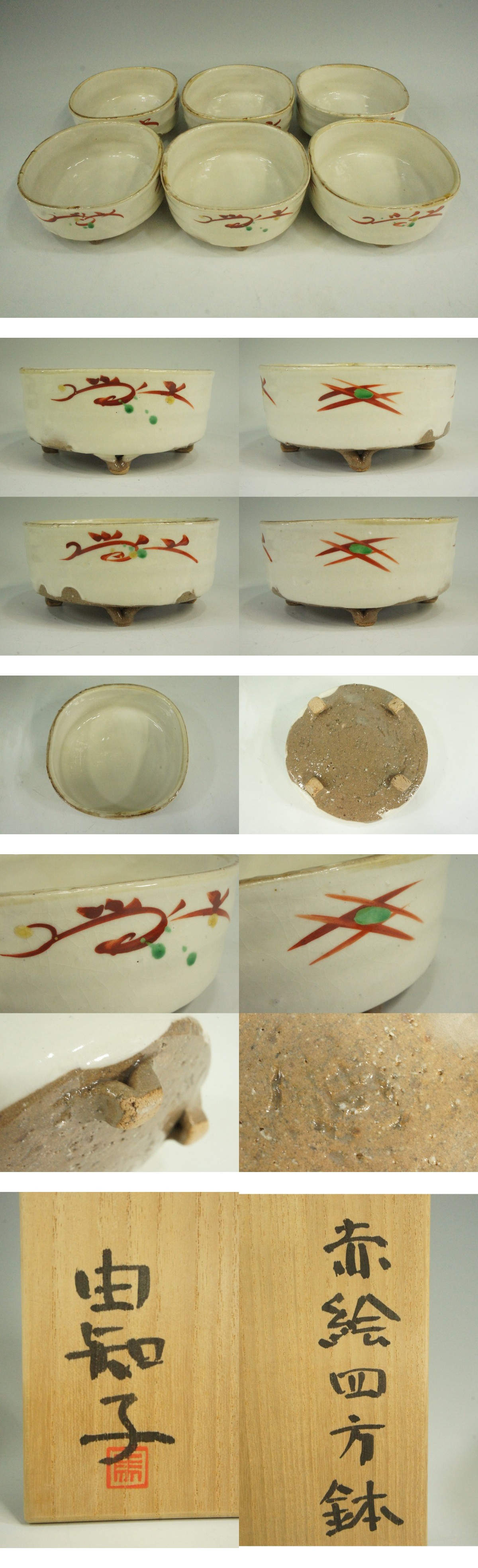 ●益子焼 馬場由知子 赤絵四方鉢 六枚組 菓子鉢 深鉢 やや汚れ有 共箱 共布