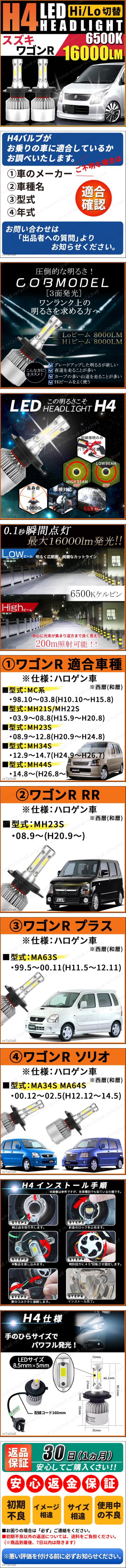 | 商品説明 | 【商品説明】 自動車用 H4ハロゲンバルブ交換用2個セットです。 <適合車種> ■車 種:ワゴンR 専用 ■用 途:LEDヘッドライト ■仕 様:純正ハロゲン車 ■装着バルブ:Hi/Lo H4対応 ■作 業:オールインワン一体型で純正バルブの取替 ■車検対応品:各エリアの検査官により差があるため 専門店へもご相談ください。 ========================================= 【適合型式】 ①ワゴンR ・型式:MC系 ・1998年10月 ~ 2003年8月 (平成10年10月 ~ 平成15年8月) ・型式:MH21S/MH22S ・2003年9月 ~ 2008年8月 (平成15年9月 ~ 平成20年8月) ・型式:MH23S ・2008年9月 ~ 2012年8月 (平成20年9月 ~ 平成24年8月) ・型式:MH34S ・2012年9月 ~ 2014年7月 (平成24年9月 ~ 平成26年7月) ・型式:MH44S ・2014年8月 ~ (平成26年8月 ~ ) ②ワゴンR RR ・型式:MH23S ・2008年9月 ~ (平成20年9月 ~ ) ③ ワゴンR プラス ・型式:MA63S ・1999年5月 ~ 2000年11月 (平成11年5月 ~ 平成12年11月) ④ワゴンR ソリオ ・型式:MA34S / MA64S ・2000年12月 ~ 2002年5月 (平成12年12月 ~ 平成14年5月) ========================================= ■適合に関しては、オプション、グレード等により装着されている バルブが一部異なる場合もございます。 必ず現車にてご確認下さい。 ■ご不明な点がございましたら、お気軽にご質問ください。 ________ 【詳細情報】 ケルビン数 : 6500K 輝度 : LO:8000LM Hi:8000LM(合計16000LM) LEDチップ : COB全面発光チップ 本体材質 : アルミ合金 電源 : 9~32V 消費電力 : 36W 商品サイズ : 約90mm×35mm 防水標準 : IP65 使用温度 : -40℃~80℃ 製品寿命 : 30,000時間以上(約15年) ________ 【配送方法】 ・宅急便コンパクト(匿名配送) 【安心保証】 ・1ヵ月以内の不具合につきましては無償での お取替えを実施いたします。 ________ |