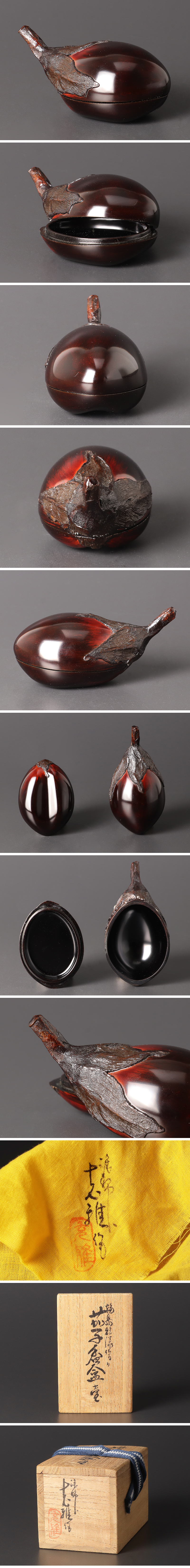 漆の艶やかな輝きが、茄子の瑞々しいさや素朴さを引き立てる香合です。 ★商品は川岸充雅の作品である事を保証致します。 |