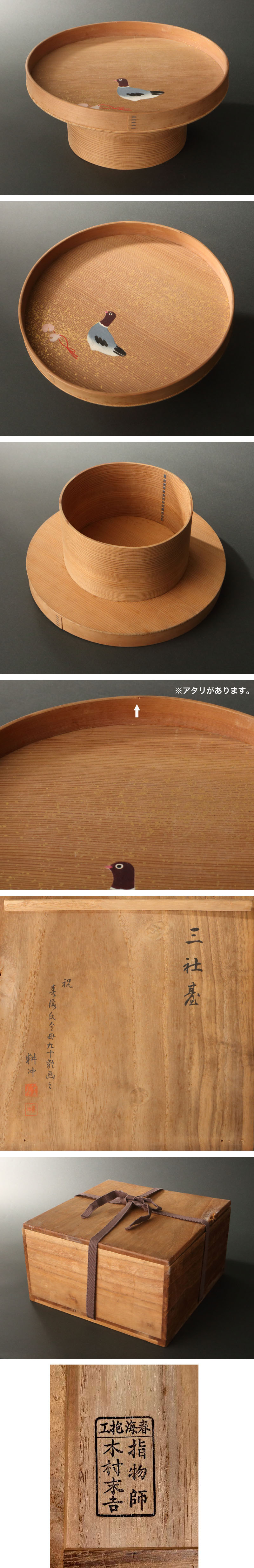 木村末吉の三社台です。 曲げ物の丸三宝です。「三社」の名の通り、大坂の四条派画家・上田耕沖(耕冲)により八幡の神使である鳩が描かれております。製作を委嘱した春海商店店主・春海藤次郎(春海痴漸)の母の卒寿(鳩寿)を記念した作品です。 痴漸は「蝉なくや茶をのむ母のきげん顔」の句を遺した事で知られ(『大阪人物誌』)、維新前に若くして家業を継いだ息子を支え、名だたる数寄者たちが集った彼の茶事を賑わせただろう母堂への特別な思いが感ぜられます。 ぬくもりが感ぜられる逸品です。 ◆上田耕沖 江戸後期-明治期の画家。上田耕夫の子。大坂で長山孔寅にまなぶ。死の前年に大阪天満宮に襖絵「鷹狩と雪中老松」をえがいたという。明治44(1910)年没、93歳。京都出身。通称は万次郎。 ◆木村末吉 明治期の指物師。大阪の人。 ◆春海痴漸 明治期の数寄者。道具商。春海藤作の子。碌々斎・一指斎に茶道を学び、和歌俳諧を能くする。戸田露吟・山中吉郎兵衛とともに大阪道具商三傑と称され、変転著しい明治期の茶の湯を牽引。明治43(1910)年没、71歳。 〔箱蓋裏〕 三社台 祝 春海氏令母九十齢画之 耕沖(印) 付属:共箱が付属します。 寸法:高さ11cm、幅23.5cm(最大幅。若干の誤差はご了承下さい) 状態:経年感、使用感、わずかなアタリがございます。 |