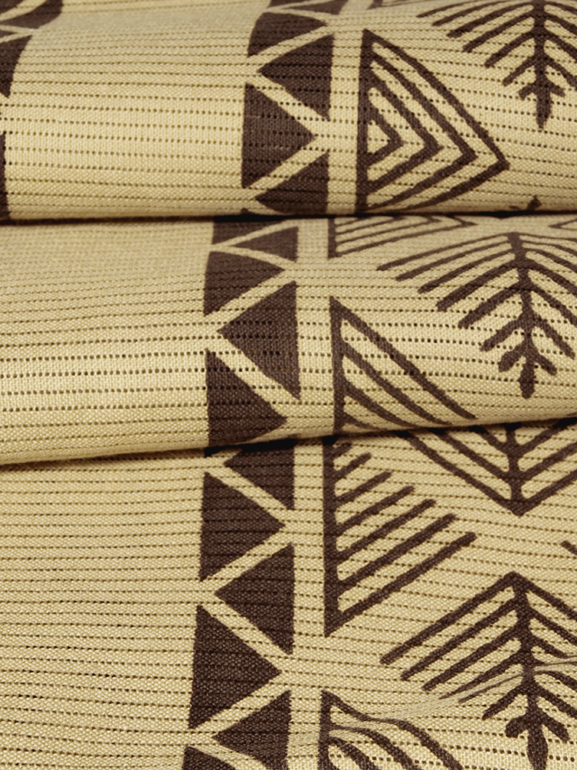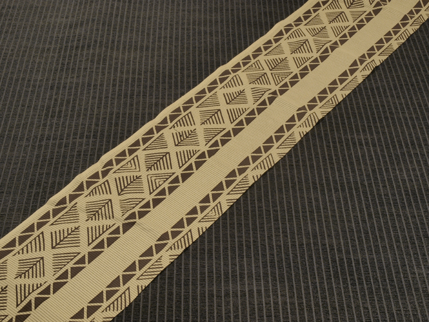 乾いたお色目に幾何学的な意匠がモダンで格好良い雰囲気です。民族布調でもあり、現代的でもあり、不思議な趣きが感じられます。