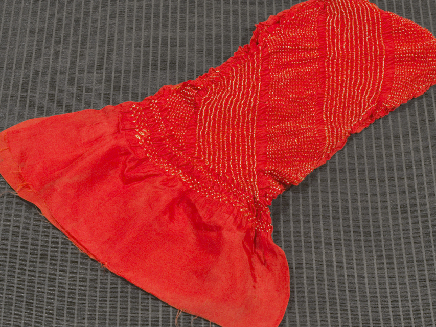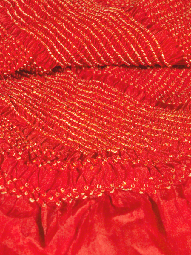 深緋(こきひ)色の地に、総絞りでななめ縞の文様が施されている、羽二重の子ども用の帯揚げです。 大正から昭和初期ごろにつくられたと思われるアンティークのお品です。紅花染めの深みのある赤色がアンティークならではです。 両端部の絞り抜き部分に直径約 1mm の小穴が数か所ほどあります。そのほかに目につく大きなしみやよごれ、褪色などのダメージはなく、この時代のものとしてはきれいな状態ですが、上記のとおり、小穴のダメージがあるため、状態ランク=「D」のご着用対象外、リメイク素材用とさせていただきます。 |