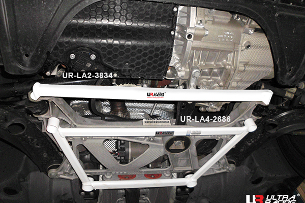 フロントメンバーブレース フロントはコーナリングなどの旋回時にロールしてしまうとハンドリングの調整が難しい為、思った通りのコーナリングが出来ず、調整を行うためにやむを得ず減速してしまう。タイヤが左右に常時動いている為、ボディのフロント側はより捻じれ、歪みやすい。また、ブレーキの際は全体の荷重が必ずフロントに掛かる為、不安定になりやすい。更に縦方向に、しなるなど、あらゆる方向から捻じれてしまい、歪みが生じ経年劣化も進みやすくなる。 フロントの剛性を高くすることによりロールや捻じれ歪みを抑制し、アライメントも変化しにくくなる。ウルトラレーシングのフロントメンバーブレースは車種により支持点を変えることで最適な操舵性能を引き出すことが出来る。つまり、コーナリングなどの旋回時にロールを抑制しハンドリングがしやすくなる。左右のサスペンション本来の性能を最大限に発揮することによりタイヤの踏ん張りが効く為、前輪駆動車4WD車のトラクション、コーナーの立ち上がりが安定し、加速性も向上することで速度の出る大きなコーナーを爽快に駆け抜けることが出来る。また、ステアリングのパフォーマンスがより向上する為、サーキットでの負荷のかかるコーナーも違和感なく走行可能である。一般走行において、緊急時の急ハンドルなど事故回避にも繋がる。旋回時だけでなく、ブレーキング時の安定感も高まることで荷重移動による縦のしなりもなくなり、安定したブレーキングが可能となり、不快感が改善出来る。
