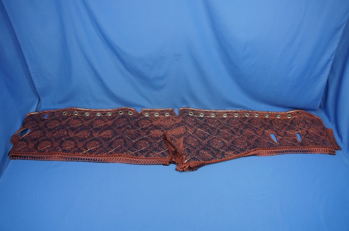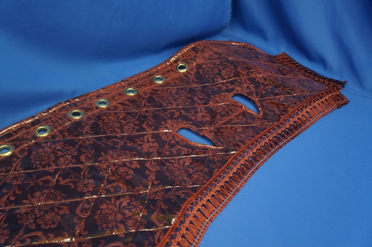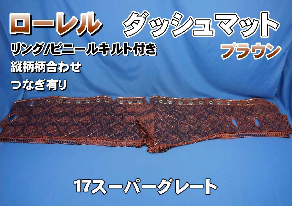 | 商品紹介 | ■ダッシュマット ■ビニールキルト付き ■ゴールドリング付き ■柄:ローレル(縦柄柄合わせ・つなぎ有り) ■色:ブラウン ■フレンジ:ブラウン ※他の生地、色もございますので、お問い合わせください! ※同色の生地フロアマット等も製作可能です。お問い合わせ下さい! |