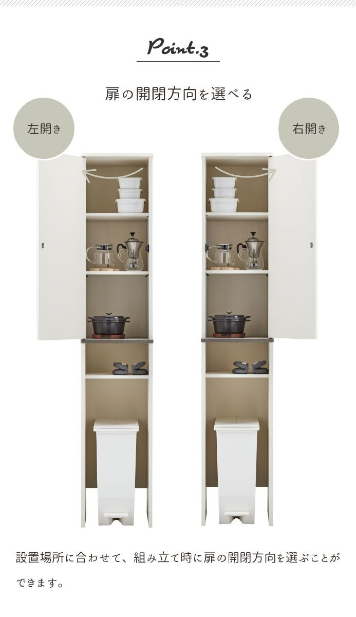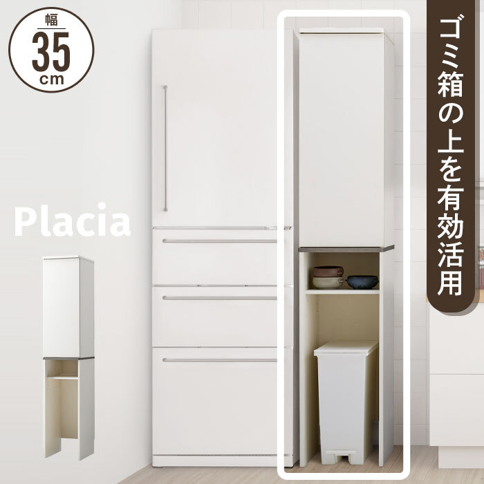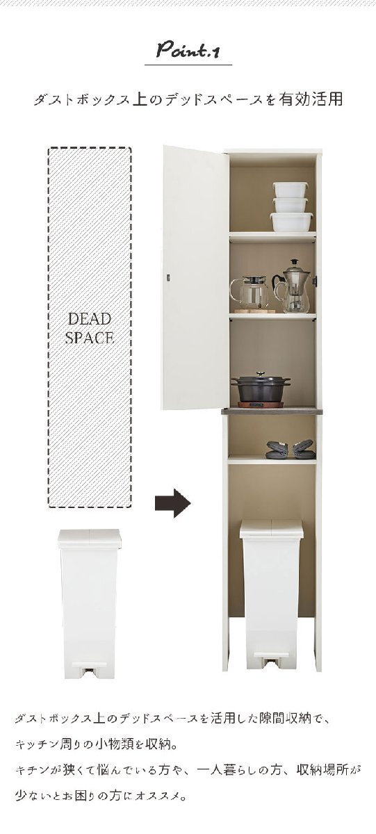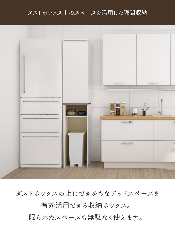 | ゴミ箱の上のデッドスペースを有効活用できる隙間収納庫。 上部はプッシュ式木扉で隠しておきたい小物をすっきり収納できます。 扉は左右開きどちらでも組立時に選択可能。 幅35cm・50cmの2サイズでキッチンだけでなく、洗面所でも活躍します。 (※このページは幅35cmを販売しております。) 壁にぴったり出来る巾木避け加工。 |