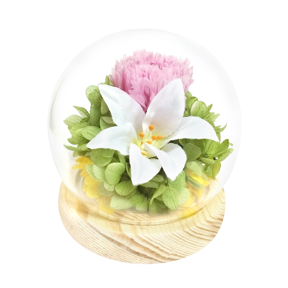 | 素材 | [プリザーブドフラワー、ドライフラワー]自然素材 [アーティシャルフラワー]ポリエステル、ポリエチレン [ドーム]ガラス [台座]木製 [フローラルフォーム]フェノール樹脂 |