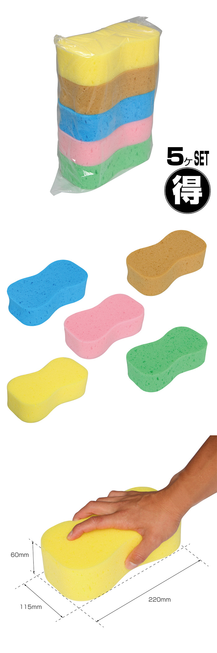 ひょうたん型の洗車用スポンジ5個パック。色の使い分けで使用できるお得なセットです。 ![]() ![]()