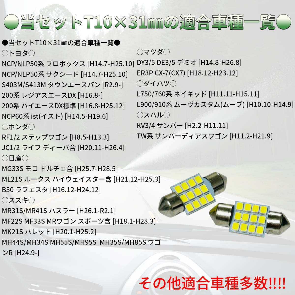 | ○適合車種は、出品画像にてご確認ください○ 【セット内容】 LED ルームランプ 2個セット 【製品スペック】 [ソケット形状] T10×31mm [搭載LEDチップ] SMD2835 [LEDチップ数] 12連 [カラー]ホワイト [サイズ]全長約15mm 幅約31mm [適合車両]12V車専用 【ご注意】 ◎年式・車両型式が一致していても、仕様等により違いがございます。念の為現車でのご確認をお願い致します。 ◎純正LED箇所には適合しませんのでご注意下さい。 |