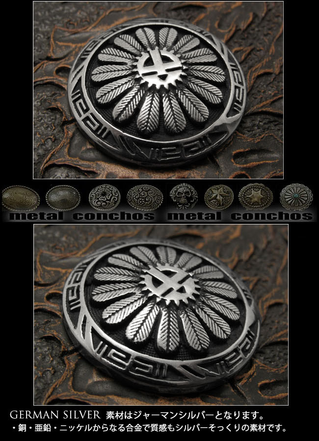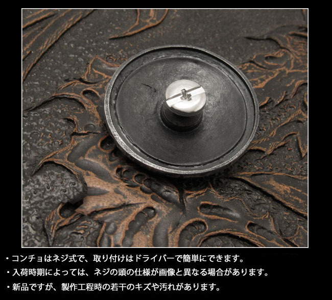 | 商品詳細 素材はジャーマンシルバーとなります。銅・亜鉛・ニッケルからなる合金で質感もシルバーそっくりの素材です。コンチョはネジ式で、取り付けはドライバーで簡単にできます。新品ですが、製作工程時の若干のキズや汚れがございます。革の緩衝材(ワッシャー/パッチ)をお付けしています。ベルト、バッグ、スマホケースなどのアクセサリーとしても使用できます! |