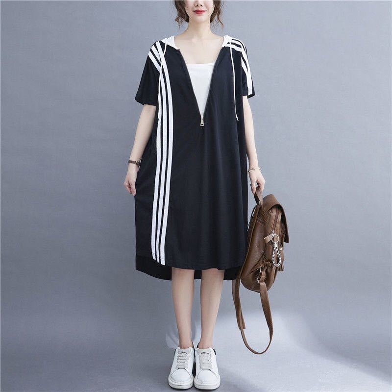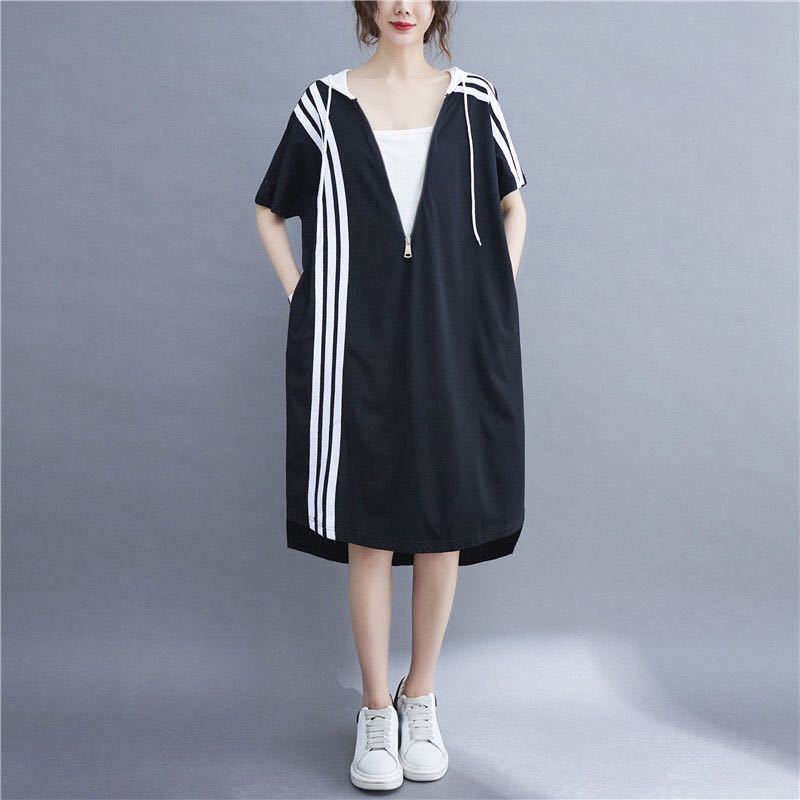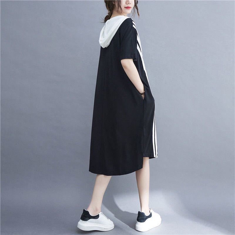 レディース tシャツワンピース サイドライン フード付き 夏 ゆったり 半袖 重ね着風 大きいサイズ 可愛い LWDA162(2色M-5XL)| 出价者 | 信用 | 价格 | 时间 |
