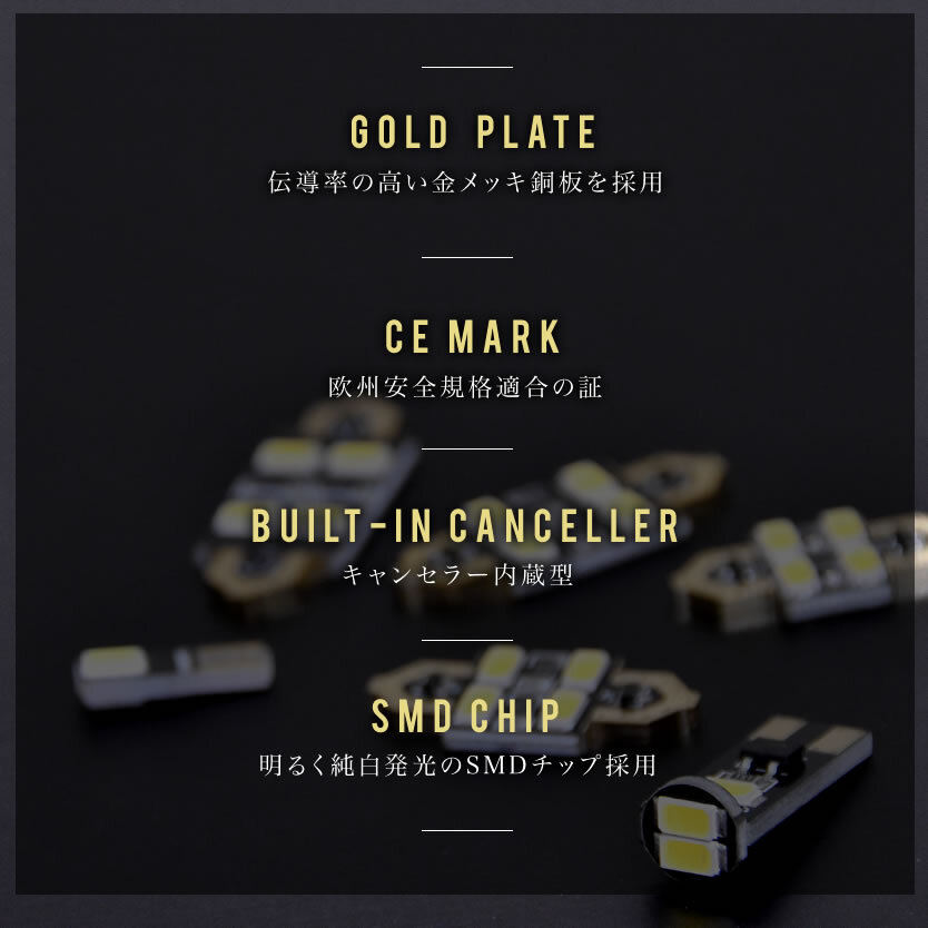 | キャンセラー内蔵LEDルームランプ! 高品質で高級感がある金メッキタイプ ■電気伝導率が高い銅版を使用し、金メッキでコーティング! ■黒基板だから取付後も目立ちにくくインテリアの雰囲気を損なわない! ■高級感のある鮮明な純白発光! 【確認事項】 ※純正LEDルームランプ装着車は取付不可 ※年式・グレード等で仕様が異なる場合があり記載端子形状以外であっても交換・返品は一切不可 ※若干の光が残る(ゴースト・微点灯)場合がありますが、LEDの特性であり商品不良ではありません。別途、抵抗を取り付けて消すことができます。 |