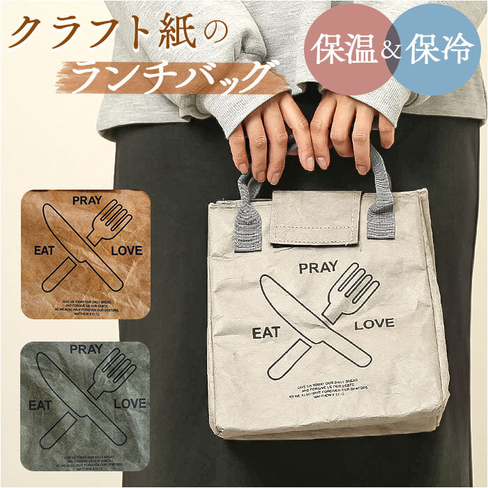 | 商品説明 | ・・軽くて、エコで、自分らしいシンプルライフ!素朴な素材感が魅力の「クラフトペーパーランチバッグ」が新登場。 ・【軽いのに、タフに使える!】 ・ランチバッグの表生地全面に、紙袋のようにふわっと軽いクラフトペーパー素材を使用。丈夫で水濡れにも強く、エコで耐久性に優れたランチバッグ。(※軽く水を弾きますが、ペーパー素材のため防水仕様ではありません。水滴がかかった場合はすぐに乾いた布で拭き取ってください。) ・【たっぷり入るスクエアデザイン】 ・コンパクトなスクエア型フォルムとたっぷりのマチ幅で、ランチボックスは平置きに、500mlペットボトルは横向きにすっぽりと収納可能。(※ボトルのデザインによっては収納できない場合がございます。) ・【断熱スポンジで保冷効果長持ち】 ・バッグの生地内部には断熱効果のある発泡ポリエチレンスポンジを内蔵。バッグの中に保冷材を一緒に入れておけば、ランチタイムまでお弁当の美味しさが長持ち。 ・【内側アルミシート加工】 ・バッグの生地内側は、保温・保冷性に優れたアルミ蒸着シート仕上げ。はっ水性にも優れているので、汚れや水滴がサッと拭き取れてお手入れ簡単。 ・【ピタッと閉まって、出し入れ楽ちん】 ・バッグの開口部は、側面のスナップボタンと面ファスナーベルトでピタッと閉まって、開け閉めスムーズ。忙しい朝のお弁当の準備も手間取らない♪ ・【たたむと、とってもコンパクト】 ・使わない時には小さく折りたたんで、コンパクトに収納可能。お仕事帰りに生鮮食品やスウィーツをちょこっと買いしたときに、カバンからパッと取り出せてとっても便利。 ・【個性が光るクラフトカラー】 ・シックな色味のペーパー素材に、カトラリーのイラストと「EAT、PRAY、LOVE~食べて、祈って、恋して~」のロゴを配置したシンプルデザイン。クシャッとしたラフな質感と飾らない素朴な雰囲気で、ハンドメイド感のある仕上がりも魅力のひとつ。 |