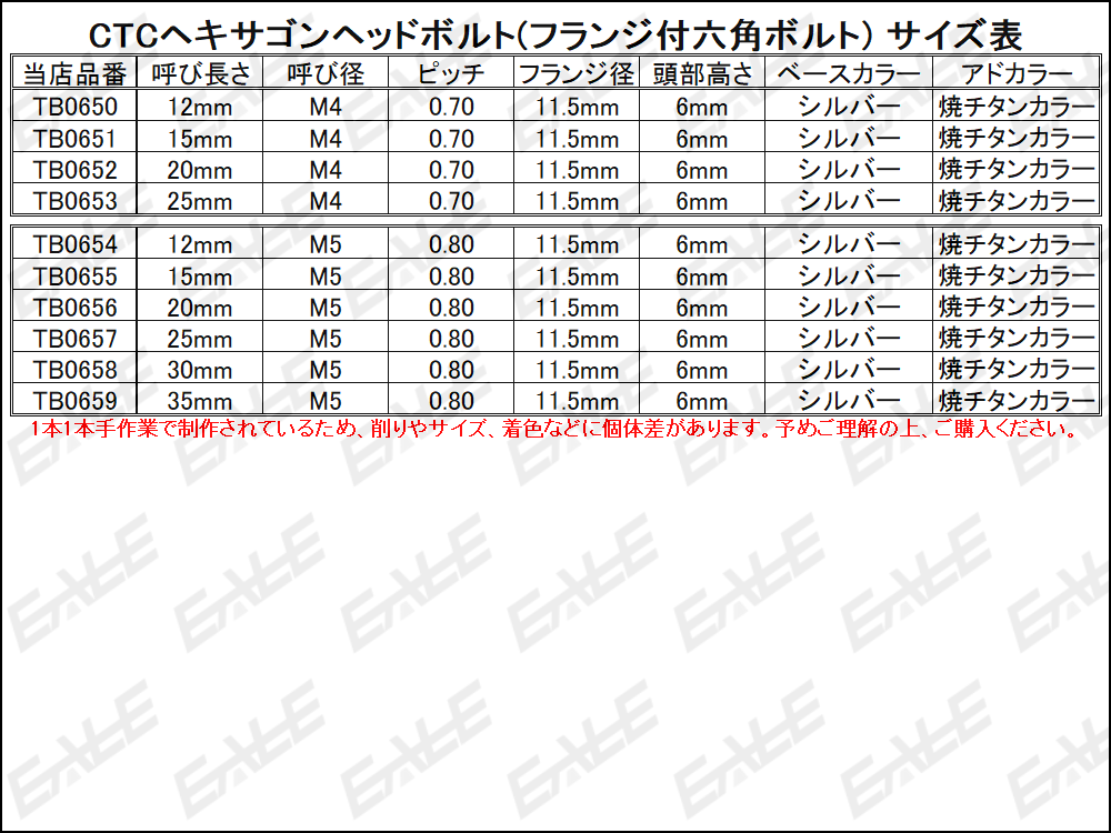 M5 CTCヘキサゴンヘッドボルト (フランジ付六角ボルト) 丁寧に削り出されたボルトは、ステンレスの地の色を活かした美しい仕上がりで、特にヘッド部分は肉抜きと穴あけ加工を施し、特殊な方法で焼チタンカラーを再現した、普通のボルトにはないオリジナルな仕上がりです。 ステンレスを使用しているので強度も十分にあり、メーター周辺やタンクキャップ、キャブ周りなどM5が使用されている場所なら色々な箇所に使用して頂けるよう各種サイズを用意しました。 ※出品は右記およびタイトルの“呼び長さ”“カラー”です。 ご落札後の変更はお受けできませんので必ずご確認下さい。 他の呼び長さは⇒ こちら 同デザインで違う呼び径・呼び長さ・カラーは⇒ こちら その他の六角ボルト・キャップボルトは⇒ こちら その他のボタンボルトは⇒ こちら その他のネジ(ビス・スクリュー)は⇒ こちら その他のナット・ワッシャーは⇒ こちら |