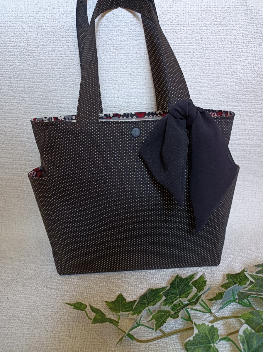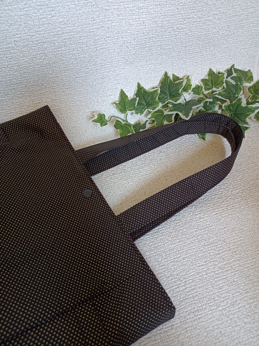 | たくさんの中からご覧頂きありがとうございます。 こちらはサイドポケット付きトートバッグです。 表地は黒地に金色の水玉 裏地は柄模様 シフォンのリボンつき(軽く結んでいるので取り外せます) サイズ…約 縦24cm×横37.5cmマチ12cm持ち手の長さ54cm 内ポケット1つ縦17cm×横20cm 綿生地です どのお洋服にも合うお色です。 プラボタン留め 接着芯を貼ってあるので多少張りがあります。 生地に織傷やネップがある場合があります。 箱ティッシュ5箱分くらいが入る大きさです。 500mlのペットボトルも並べて写真に撮っています。 参考になさってください 折りたたんでの発送になります。 丁寧な作業を心掛けていますが至らない箇所も御座います。 神経質な方や完璧な物をお求めの方はご入札をご遠慮下さい。 他にもたくさん出品しております。合わせてご覧くださいませ♪ | |||