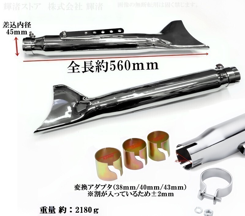 | 商品説明 | ご覧いただきありがとうございます。 【発送方法】 日本郵便ゆうパック(提携版) (1-2営業日以内に奈良県から出荷致します。) 【カラー】 メッキ (右側用が2本セット) 【内容】 スリップオンマフラー本体×2本 固定リング ×2セット ボルト、ナット、ステー ×2セット 変換アダプタ ×2セット( 約36mm/約39mm/約43mm)※割が入っているため約表示 【材質/サイズ】 差込口の内径:45mm 材質:鉄(スチール) 重量:2180g(本商品+付属品を一括計量時) 【備考】