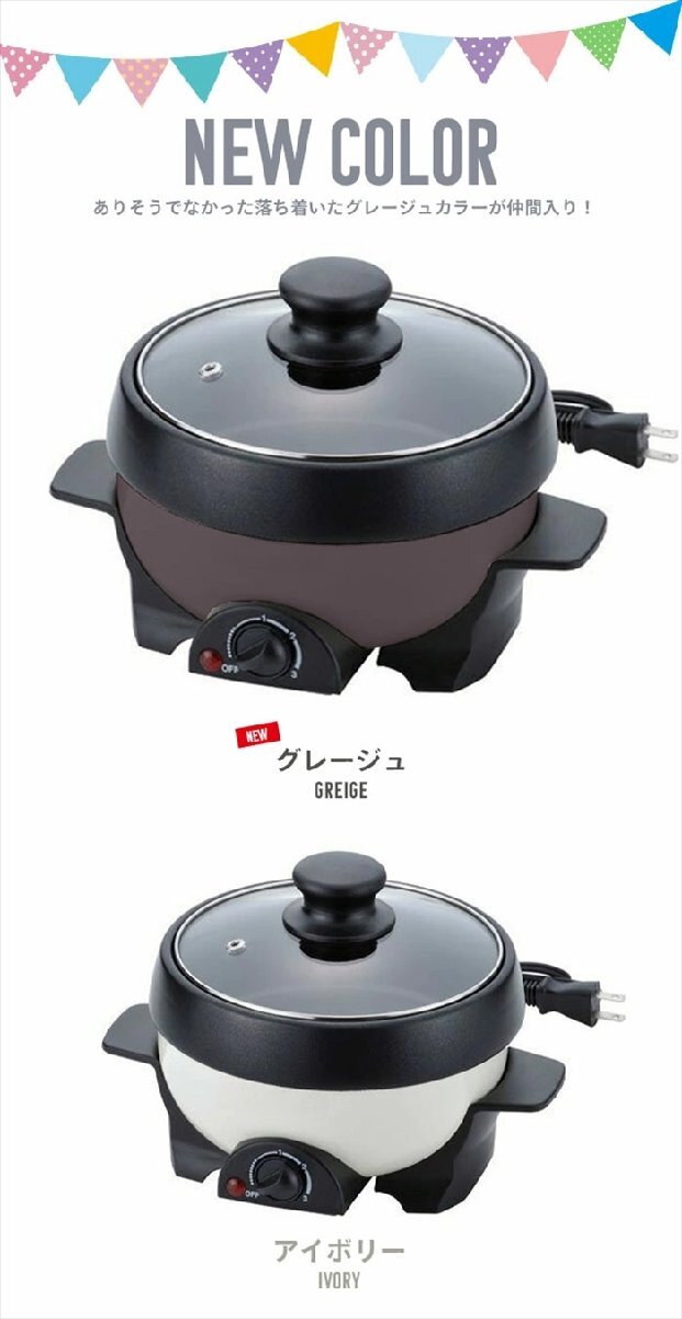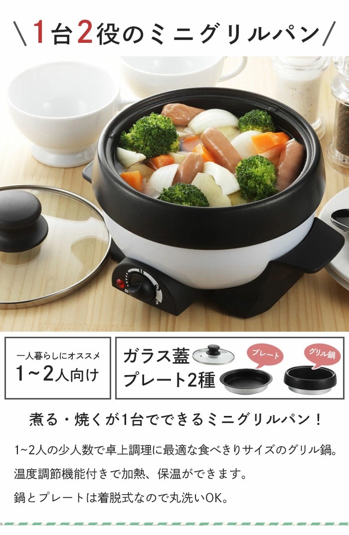 | 1人から2人で卓上調理に最適! 食べきりサイズ グリルパン&プレート付。 温度調節付きで加熱、保温が可能。 卓上で煮る、焼くが簡単に出来ます。 鍋とプレートは着脱式だから丸洗いOK。 |