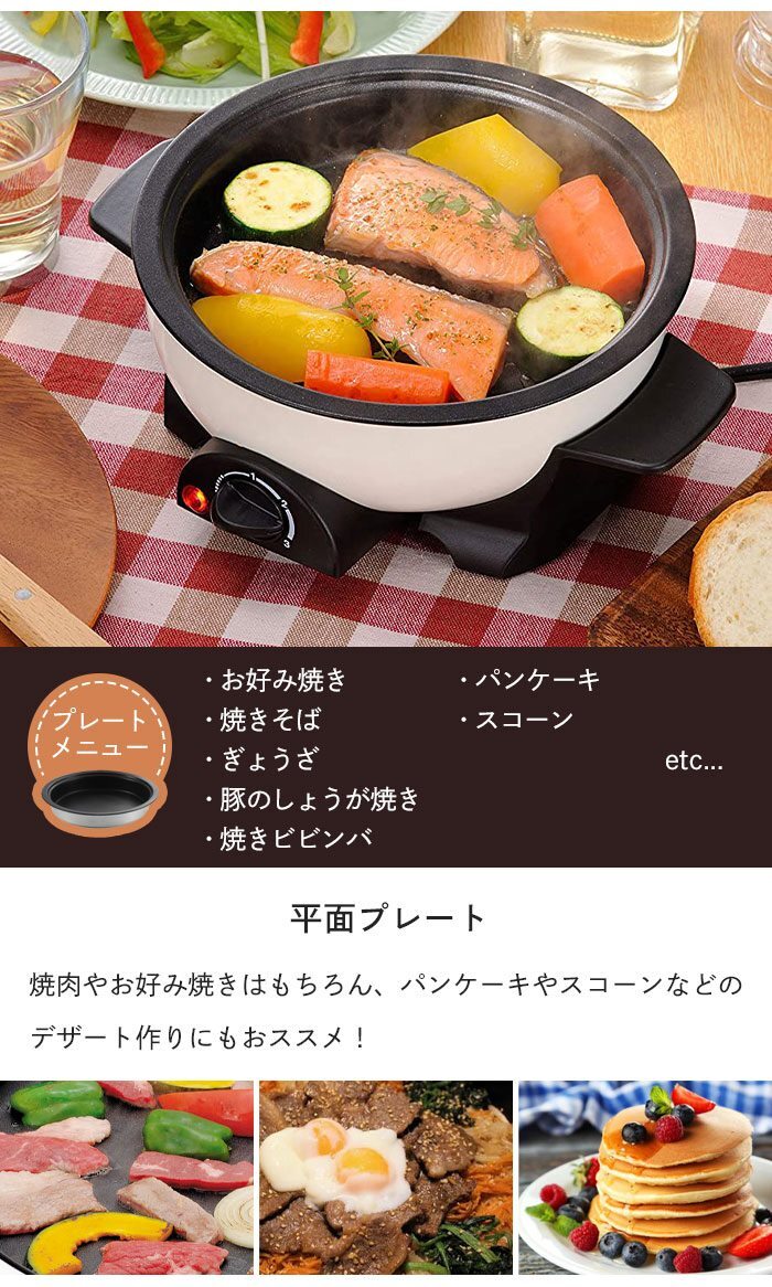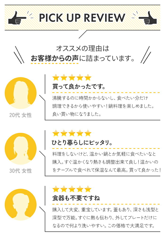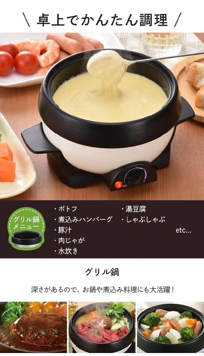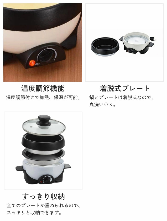 | ・1~2人にぴったりなグリルパン&プレート付き ・鍋とプレートは着脱式で丸洗いOK ・温度調節付きで加熱、保温が可能 |