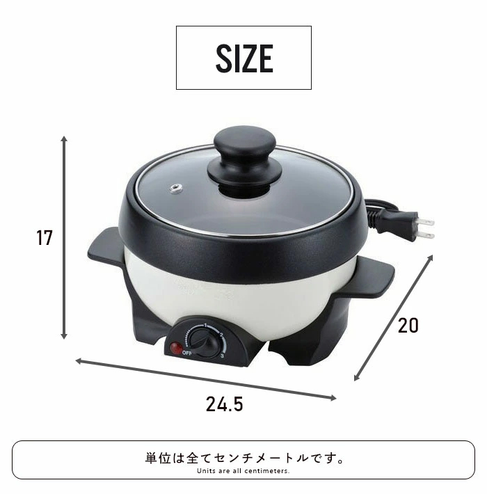 | [本体]幅24.5cm×奥行20cm×高さ17cm [鍋]内寸:16cm、深さ:5.5cm [焼き物プレート]内寸:16cm、深さ:2.5cm |