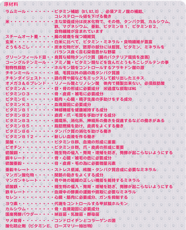 | 商品名 : DRS.CHOICE(ドクターズチョイス)アダルト 18kg(ブリーダーズパック) 【お得な送料無料商品!!】 重量商品に付き他の商品の同梱は不可 北海道・沖縄・離島等の場合は一部送料のご負担をお願い致します。 プレミアムドッグフード(成犬用 アダルト 1~6歳用 中粒 ラム&玄米) ![]() ■健康の源 自然の力・・・・・国産醗酵エキス・サメ軟骨 ■厳選された食材・・・・・・・ラムミール・玄米 ■皮膚・毛並みのサポート・・・キャノーラ油・亜麻仁油・魚油・ひまわり油 ■自然派保存料使用・・・・・・ローズマリー・ビタミンE ★★★★ DRS.CHOICE(ドクターズチョイス) アダルト 成犬用 のおすすめポイント! ★★★★ 1)国産醗酵エキスにより、整腸作用、体臭、便、尿の軽減 2)サメ軟骨の成分による関節の強化 3)オメガのバランスのよい配合によりキレイな皮膚・被毛のサポート 4)食べ易く消化しやすい円盤型の粒 5)多くの固有の生物を守る為に厳しい検疫を行っているオーストラリアにて生産しており、発注してからの生産に なる為、常により良い新鮮な物をお客様へお届けしております。 ![]() ![]() ![]() ドクターズチョイスは、粒の形状にこだわりました 犬はもともと何でも飲み込んでしまう習慣があるので、ある程度の大きさで噛ませて食べさせる必要があります。そうすることにより、消化不良などがおきにくくなり、栄養素も体に吸収されやすくなります。ドクターズチョイスは粒の形状が円盤型となっており、愛犬にとって食べ易く、噛み易い形となっております。噛む事により、脳が刺激され、発育向上を促し、消化不良を防ぎます。 ドクターズチョイスは、AAFCOとNRCの栄養基準をみたしているドッグフードです。 Association of America Food Control Official (AAFCO 米国飼料検査官協会) アメリカで厳しいドッグフード栄養基準を定めている機関です。 National Research Council (NRC 米国国家研究会議家畜栄養委員会) ・合成着色料・合成香料無添加 ・原産国 オーストラリア ![]() 主 成 分 粗タンパク質 23.0%以上 粗 脂 肪 13.0%以上 粗 繊 維 4.5%以下 灰 分 7.0%以下 水 分 10.0%以下 その他の栄養分 オメガ3脂肪酸 0.4% オメガ6脂肪酸 2.0% カルシウム 2.5%以下 340kcal/100g 原 材 料 ラムミール、米、スチームオート麦、玄米、とうもろこし、グリーンフィールド豆、コーングルテンミール、動物性脂肪、チキンミール、チキンダイジェスト、オメガ3&6ブレンド、ビタミンA、ビタミンD3、ビタミンE、ビタミンK3、ビタミンB1、ビタミンB2、ビタミンB3、ビタミンB5、ビタミンB6、ビタミンB12、葉酸、ビオチン、硫酸銅、銅キレート、硫酸亜鉛、亜鉛キレート、マンガン酸化物、マンガンキレート、硫酸鉄、鉄キレート、セレン、ヨウ素、カルシウム、国産発酵パウダー、サメ軟骨、酸化防止剤(ビタミンE、ローズマリー抽出物) ![]() ![]() 他のDRS.CHOICEドクターズチョイスシリーズやドッグフードも出品しておりますよ! |