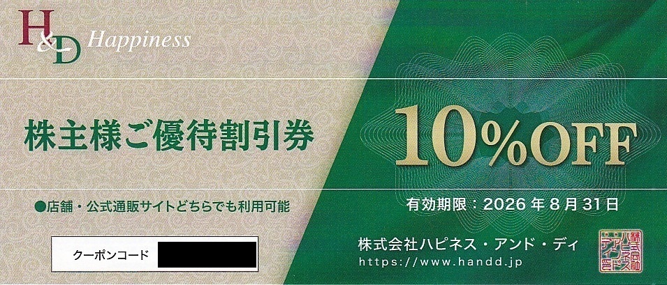 | 商品説明 | ハピネス・アンド・ディ 株主優待券 12000円分(2000円券×6枚)です。 10%OFF券 6枚も同封いたします。 2000円優待券は店舗のみ使用可能となります。 10%OFF券は、店舗、公式通販サイトのどちらでも利用可能です。 有効期間は2026年8月31日となります。 使用方法をご存じの方が、ノークレーム、ノーリターンで御願い致します。 匿名配送となる、ゆうパケットポストminiでの発送予定でよろしければ、送料は無料とさせて頂きます。 発送履歴の確認が可能です。 |