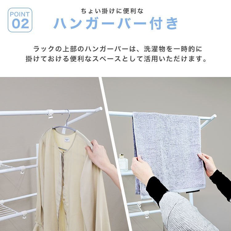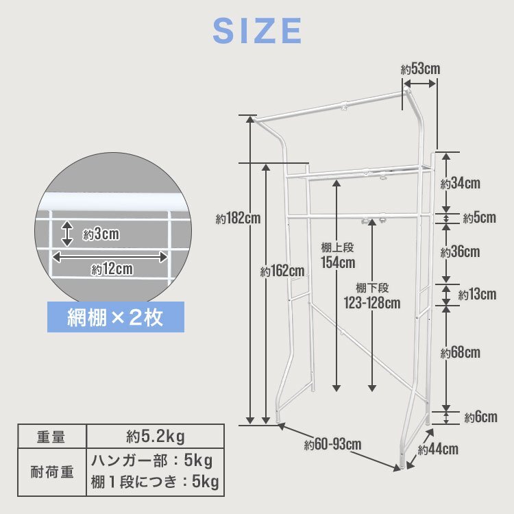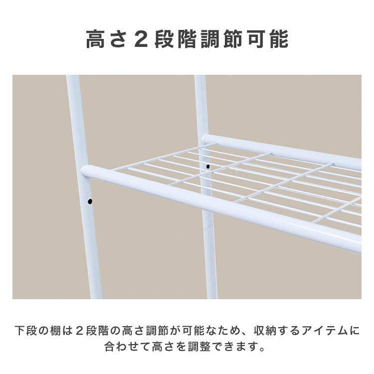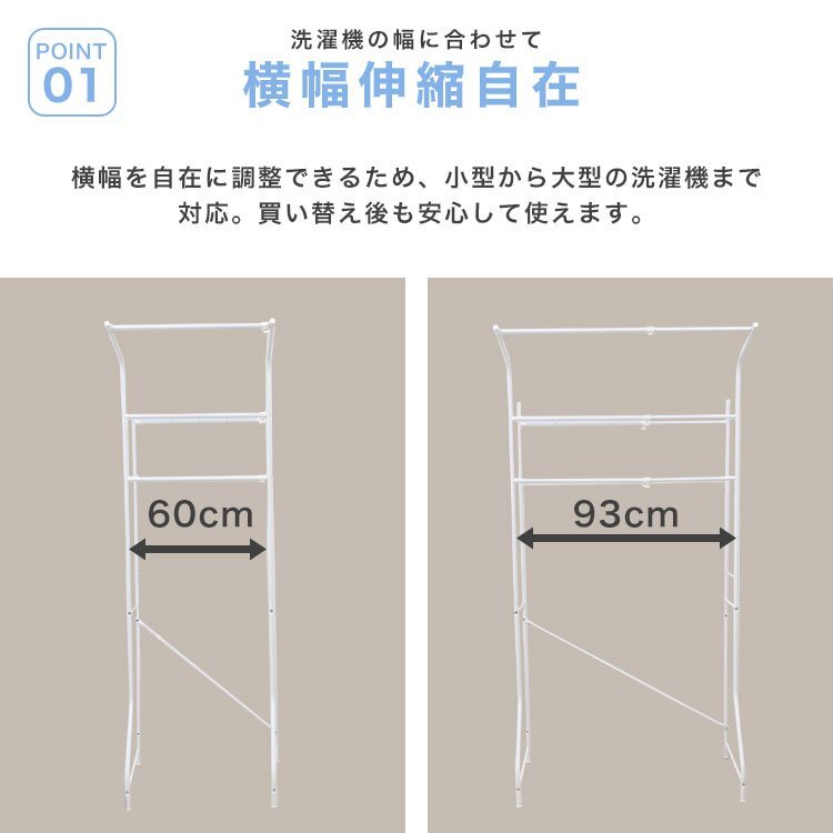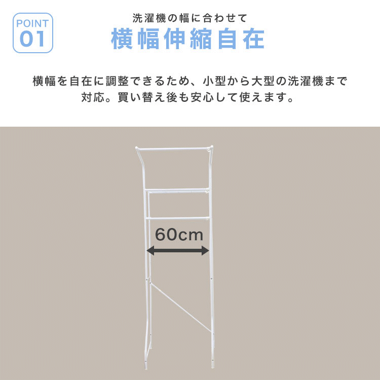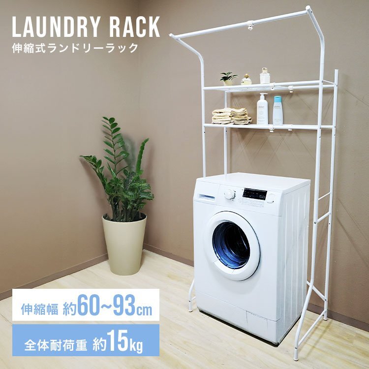 洗濯機やトレイなどの環境に合わせて幅が伸縮するのでピッタリサイズで使えます。 洗濯機から、洗濯物を干す時に便利なハンガーラック付き!外に出す前に一時的にハンガーラックで洗濯物を掛けられるので便利です。 ネット棚2枚付きで洗剤などの小物も置きやすいです。 アジャスター付き。 【商品仕様】 カラー:ホワイト サイズ(約):幅60~93cm×奥行53cmx高さ182cm 重量(約):5.2kg 棚の奥行サイズ(約):26cm 耐荷重: ・棚:5kg×2段 ・ハンガー部:5kg 材質:スチール、ポリプロピレン 他 ※お客様組み立て商品です。 |